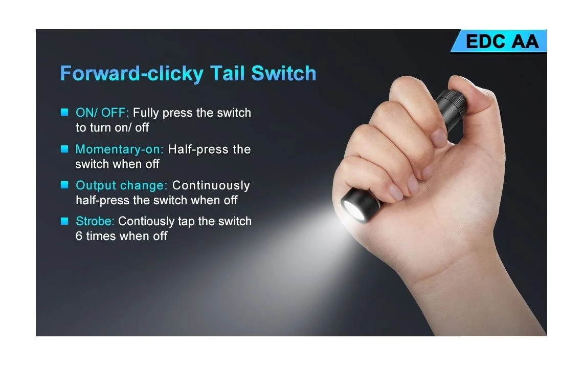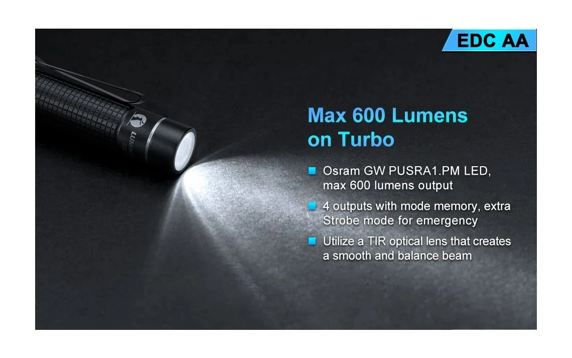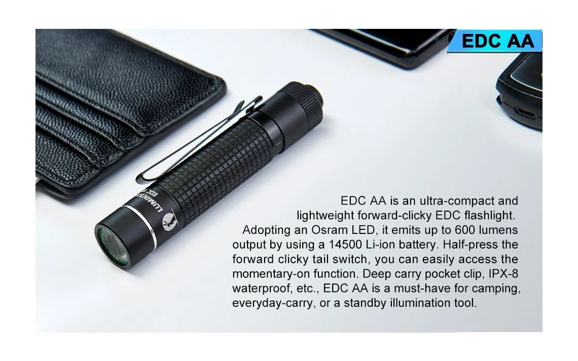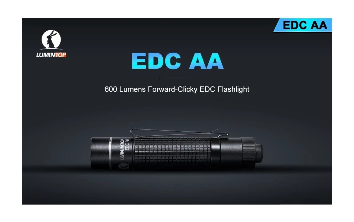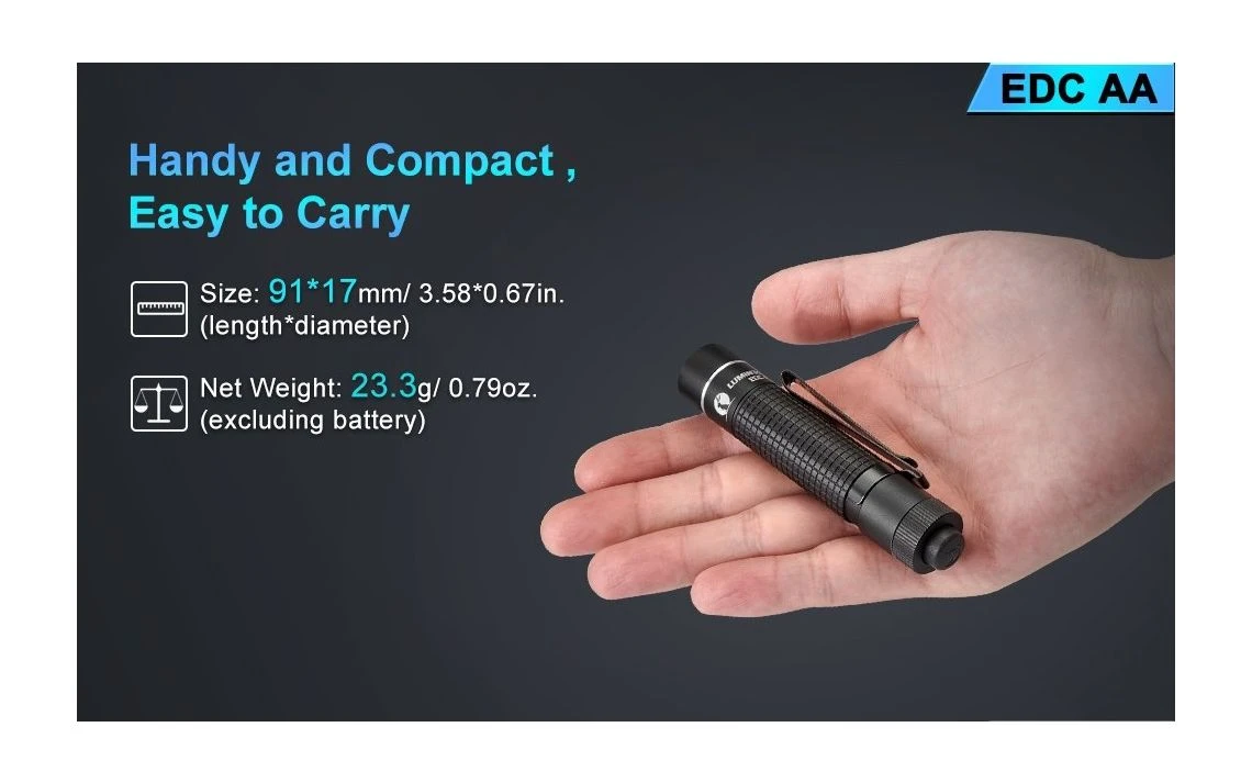 23.3g, 600 Lumens: The Lumintop EDC AA torch is an ultra-compact and lightweight tail switch EDC torch. Adopting an Osram LED, it emits up to 600 lumens output by using a 14500 Li-ion battery but is also compatible with AA batteries. The tail switch allows you to access 4 levels of output as well as a strobe mode. The dual direction and deep pocket clip makes it easy to carry in your pocket or clip onto your hat or backpack. Other features of this torch include memory mode, IP68 waterproof rating and it is made made of toughened and wear-resistant materials. This compact torch is great for everyday use, camping and outdoor activities. Compact EDC torch with tactical switch