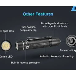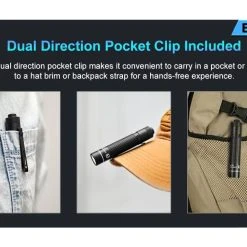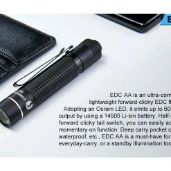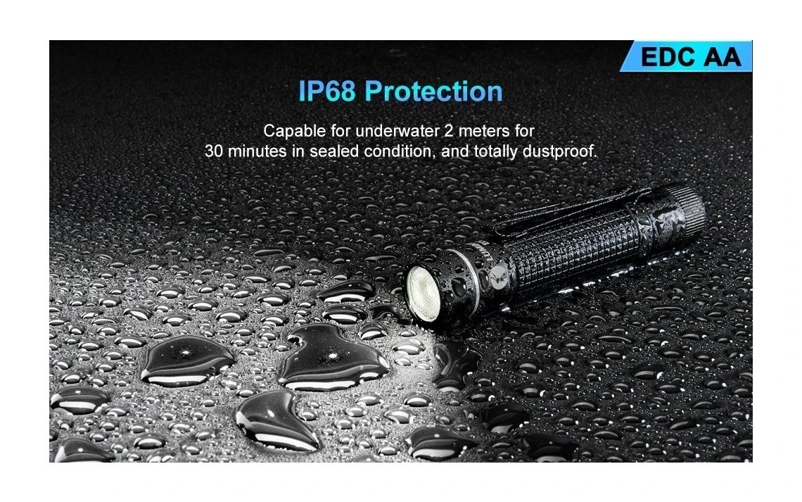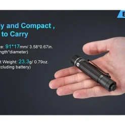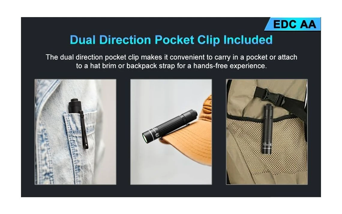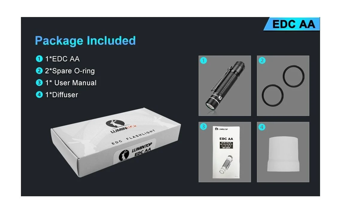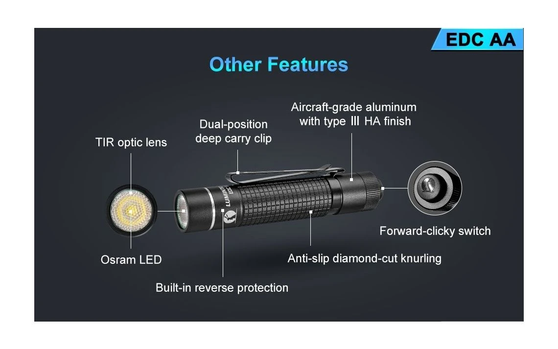23.3g, 600 Lumens: The Lumintop EDC AA torch is an ultra-compact and lightweight tail switch EDC torch. Adopting an Osram LED, it emits up to 600 lumens output by using a 14500 Li-ion battery but is also compatible with AA batteries. The tail switch allows you to access 4 levels of output as well as a strobe mode. The dual direction and deep pocket clip makes it easy to carry in your pocket or clip onto your hat or backpack. Other features of this torch include memory mode, IP68 waterproof rating and it is made made of toughened and wear-resistant materials. This compact torch is great for everyday use, camping and outdoor activities. Compact EDC torch with tactical switch