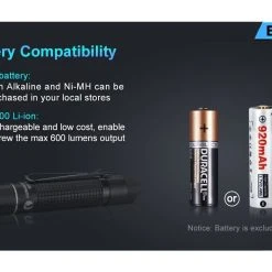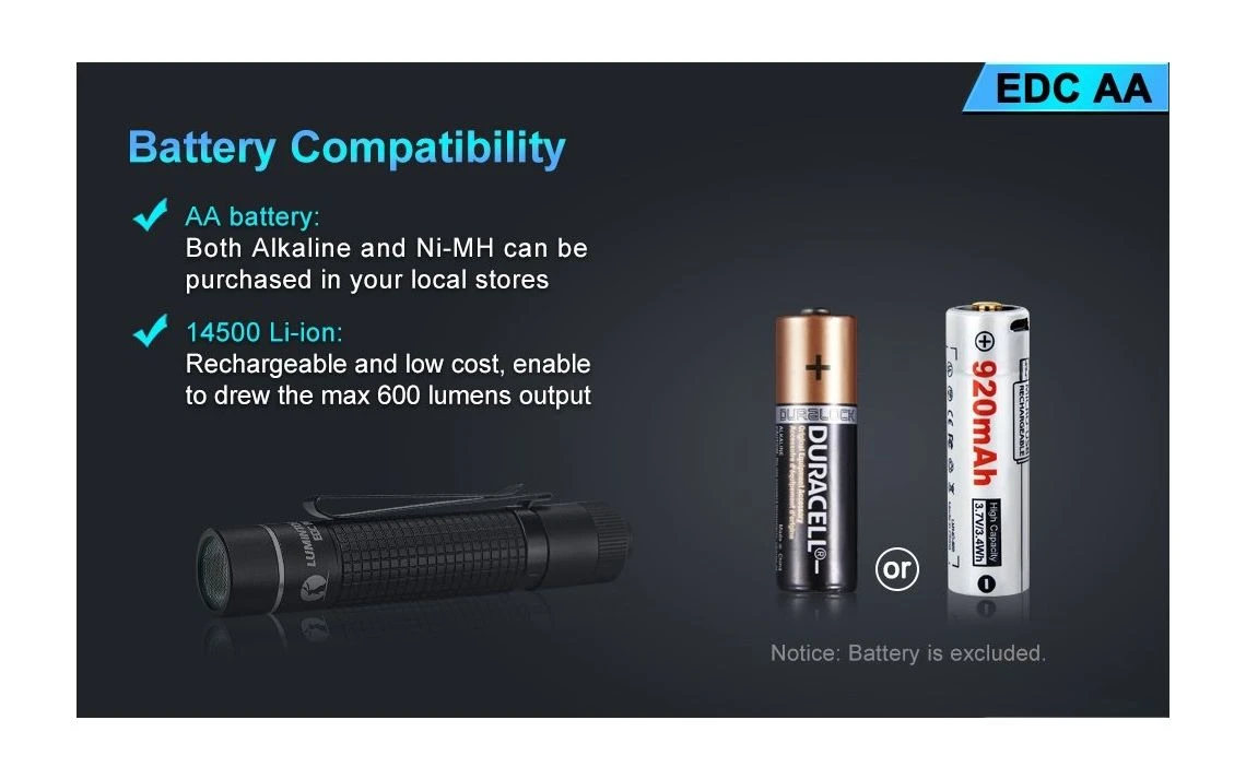 - Powered by one AA or 14500 rechargeable Li-ion battery