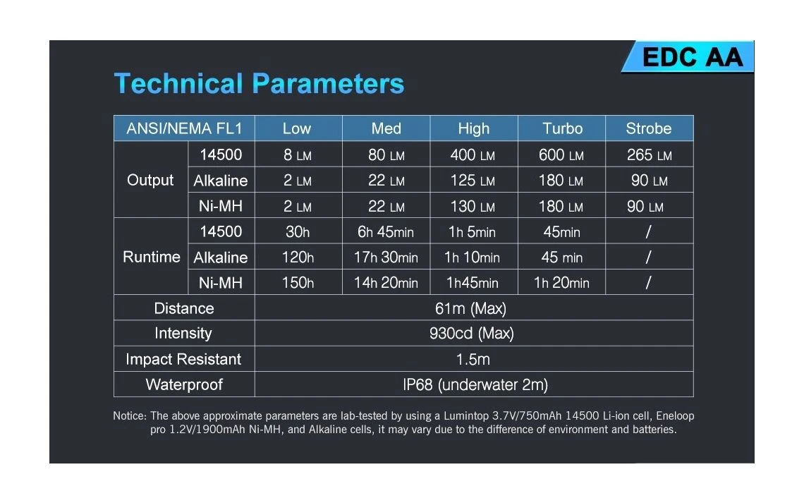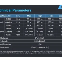 - Runs On: 1 x AA or 14500 rechargeable Li-ion battery