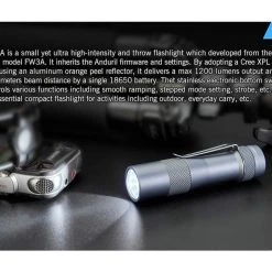 57g, 1200 Lumens, 34130cd: The Lumintop FW1A single 18650 powered LED torch. FW1A has a maximum output of 1200 lumens with a beam distance of 370 metres. It has ergonomic and compact EDC style design with one switch interface. It runs on Anduril firmware and has features likes smooth ramping, stepped mode setting, strobe, muggle mode, etc. Available in Cree XP-L HI, Nichia 219CT and Luminus SST20 LEDs. 3500mAh rechargeable battery included. Unique enthusiasts LED torch!