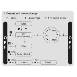 - Turbo:Â 2,250 Lumens – 40 S + 2 H 30 Mins