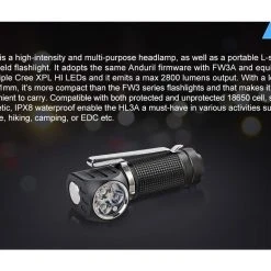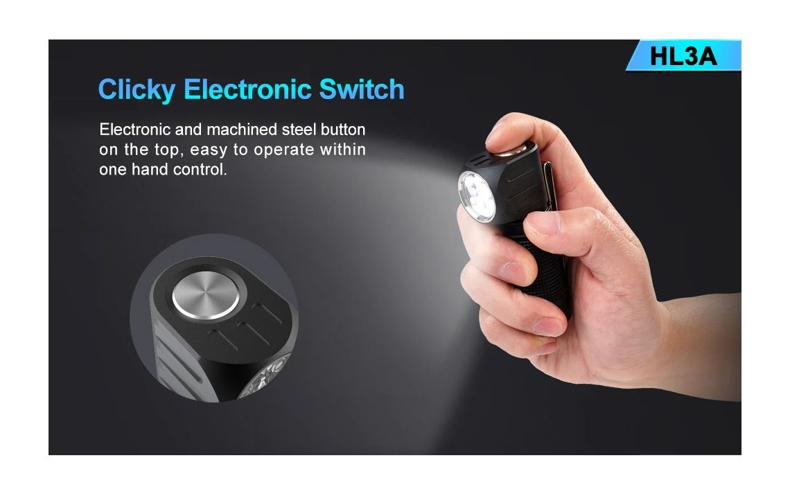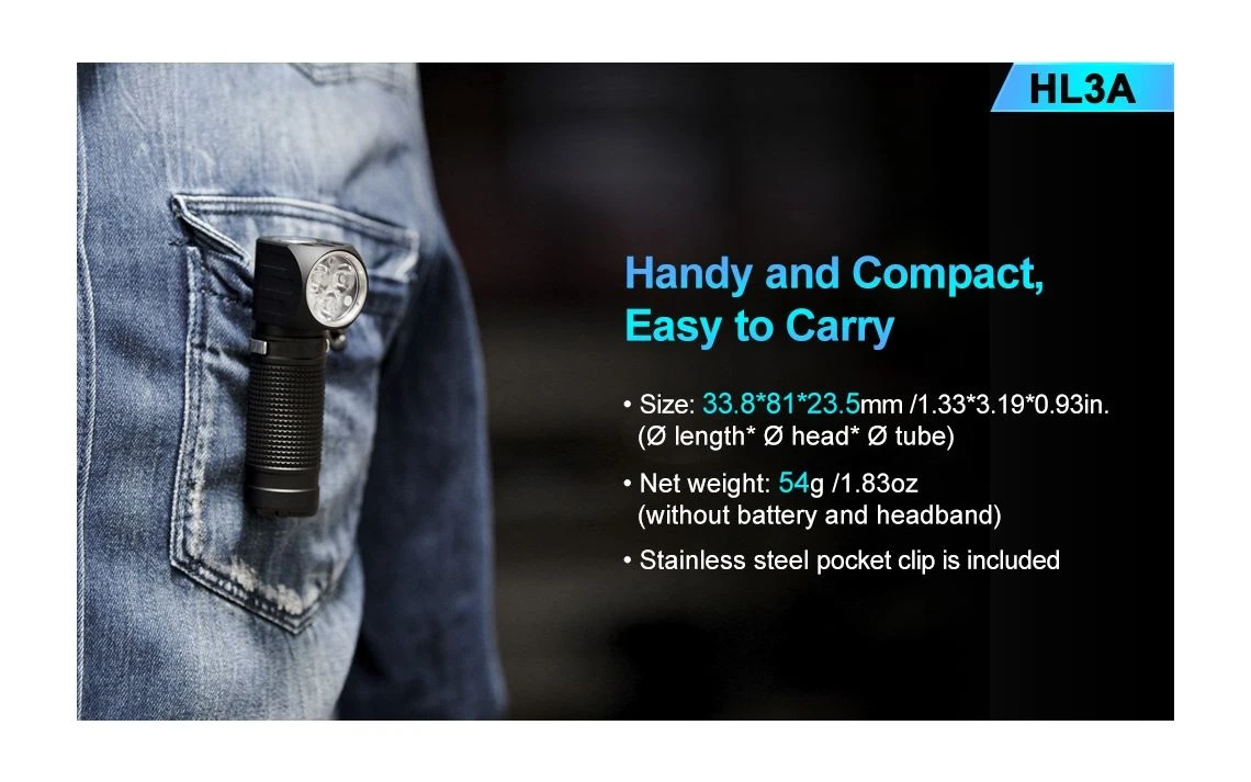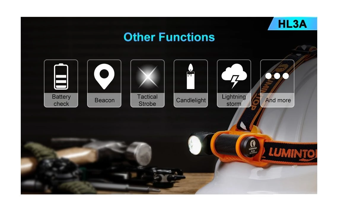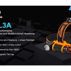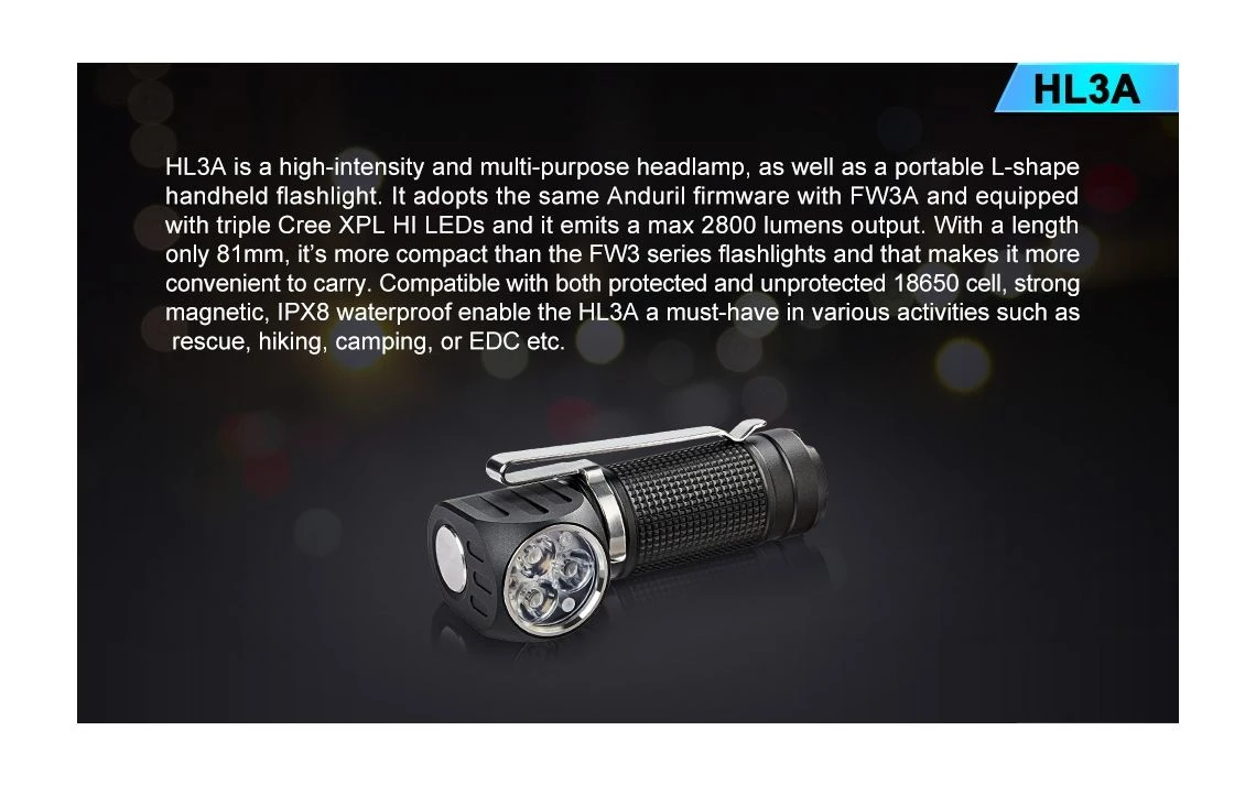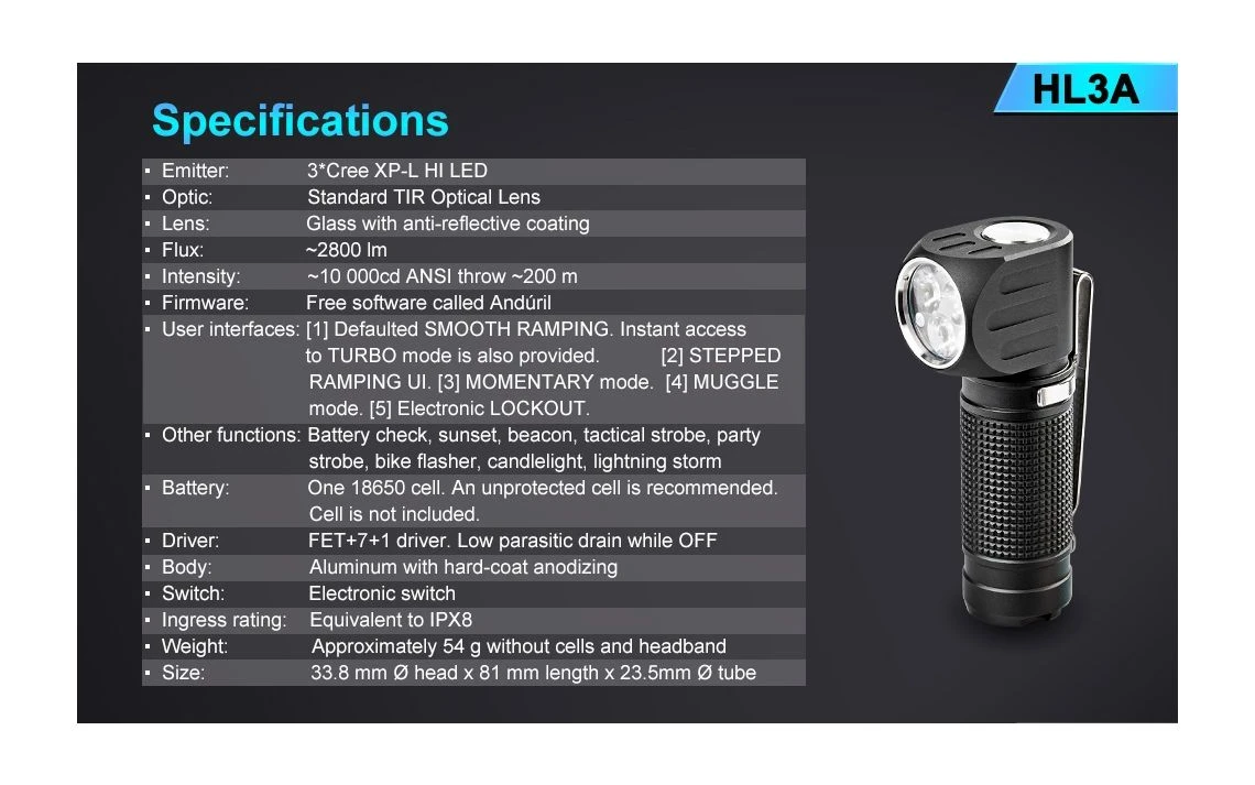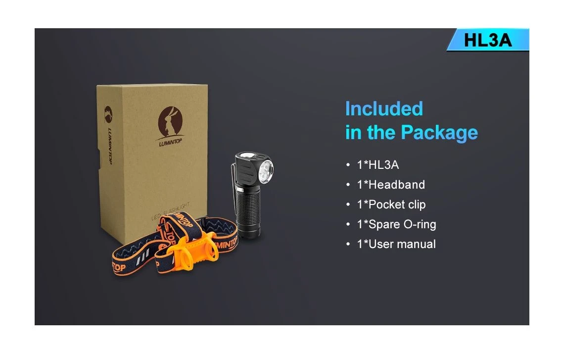 50g, 2800 Lumens: The Lumintop HL3A is new high intensity multi-purpose L-shaped handheld LED torch and headlamp. It is compatible with both protected and unprotected 18650 batteries. The HL3A is powered by a 18650 (included) and has fives different user interfaces with various other functions such as battery check, sunset, beacon, tactical strobe, party strobe modes. 3500mAh Li-ion Rechargeable 18650 Battery Included. L Shaped multi-purpose portable flashlight!