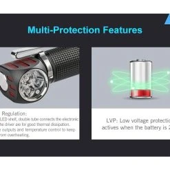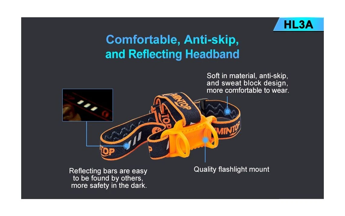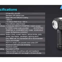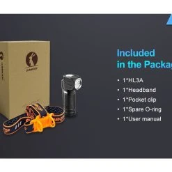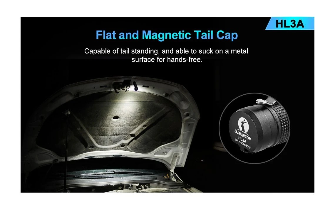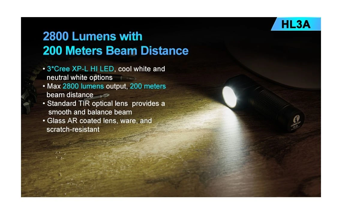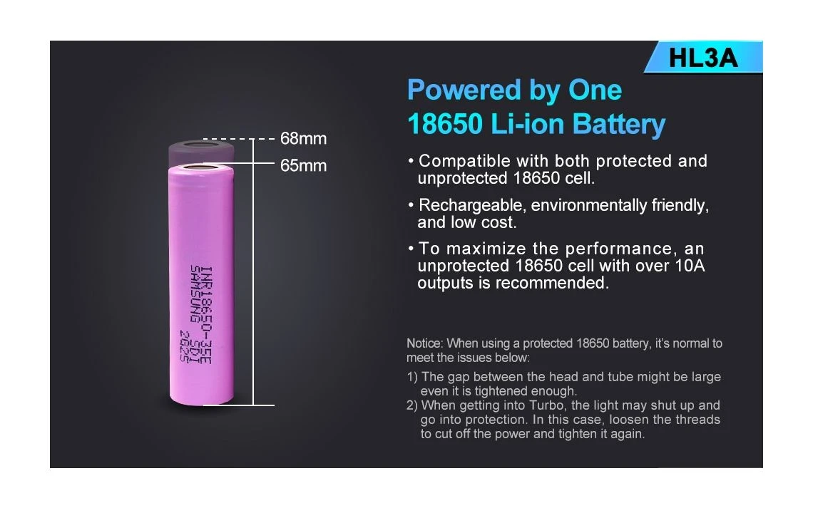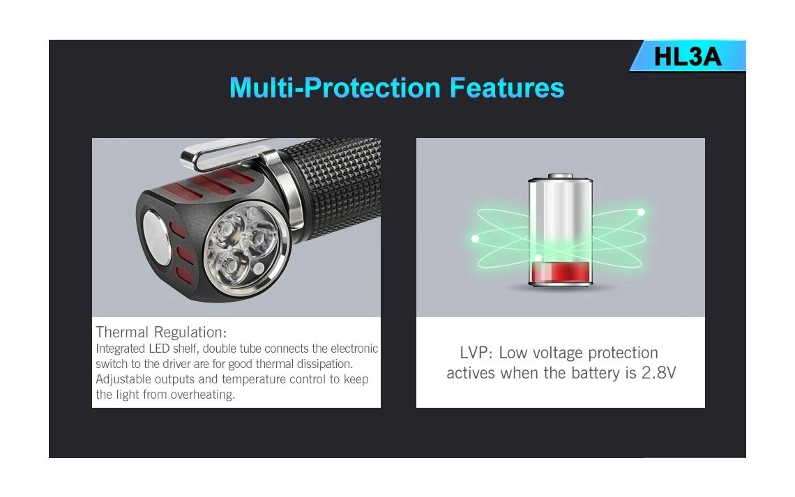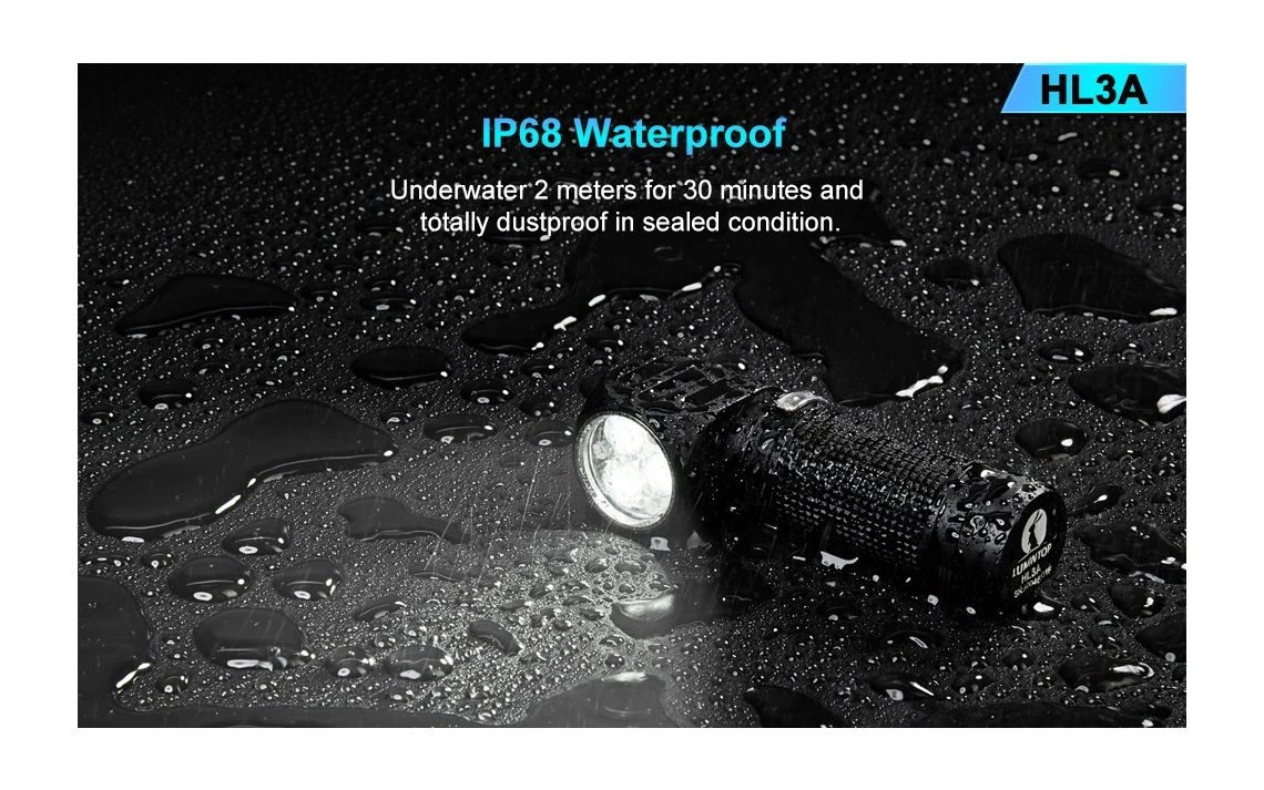 50g, 2800 Lumens: The Lumintop HL3A is new high intensity multi-purpose L-shaped handheld LED torch and headlamp. It is compatible with both protected and unprotected 18650 batteries. The HL3A is powered by a 18650 (included) and has fives different user interfaces with various other functions such as battery check, sunset, beacon, tactical strobe, party strobe modes. 3500mAh Li-ion Rechargeable 18650 Battery Included. L Shaped multi-purpose portable flashlight!