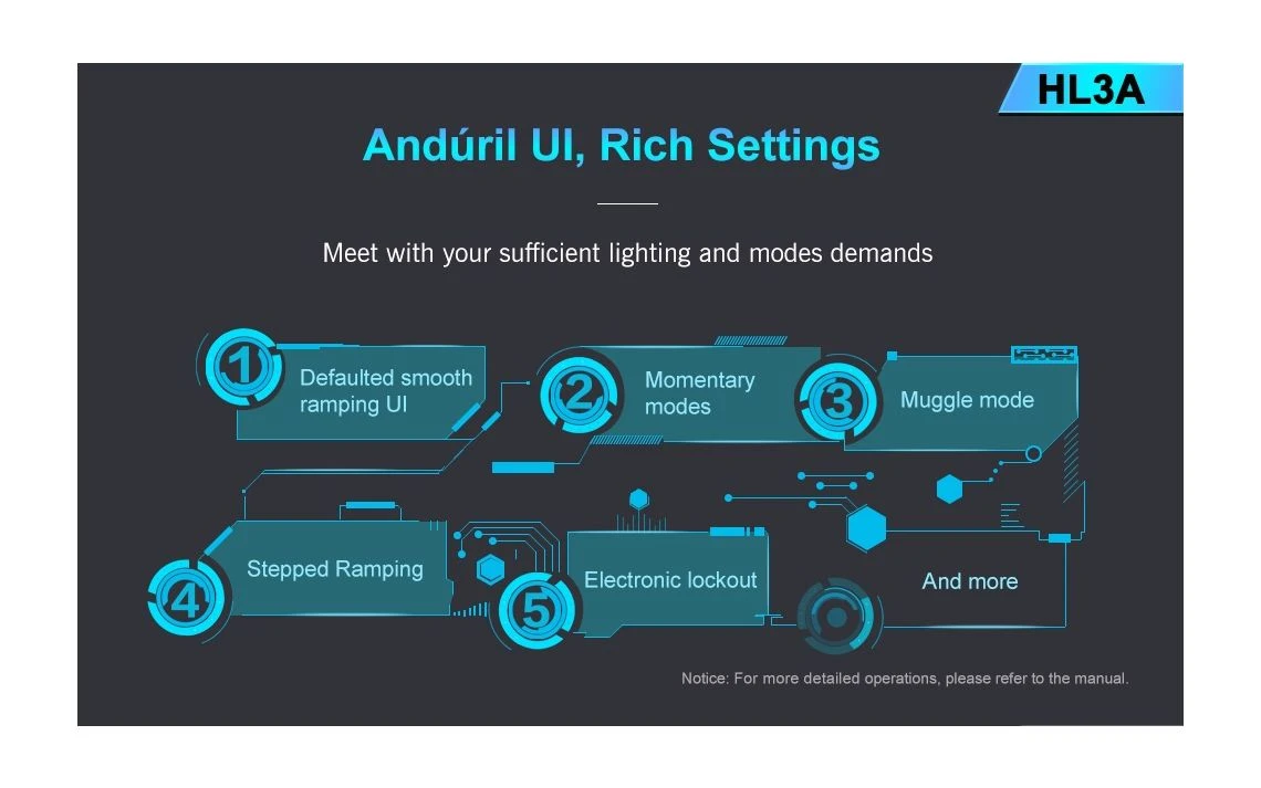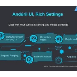- User interfaces: [1] Defaulted SMOOTH RAMPING. Instant access to TURBO mode is also provided. [2] STEPPED RAMPING UI. [3] MOMENTARY mode. [4] MUGGLE mode. [5] Electronic LOCKOUT.