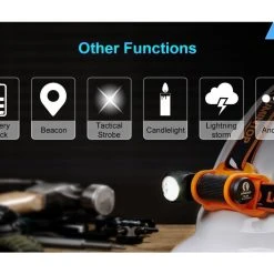 - Other functions: Battery check, sunset, beacon, tactical strobe, party strobe, bike flasher, candlelight, lightning storm