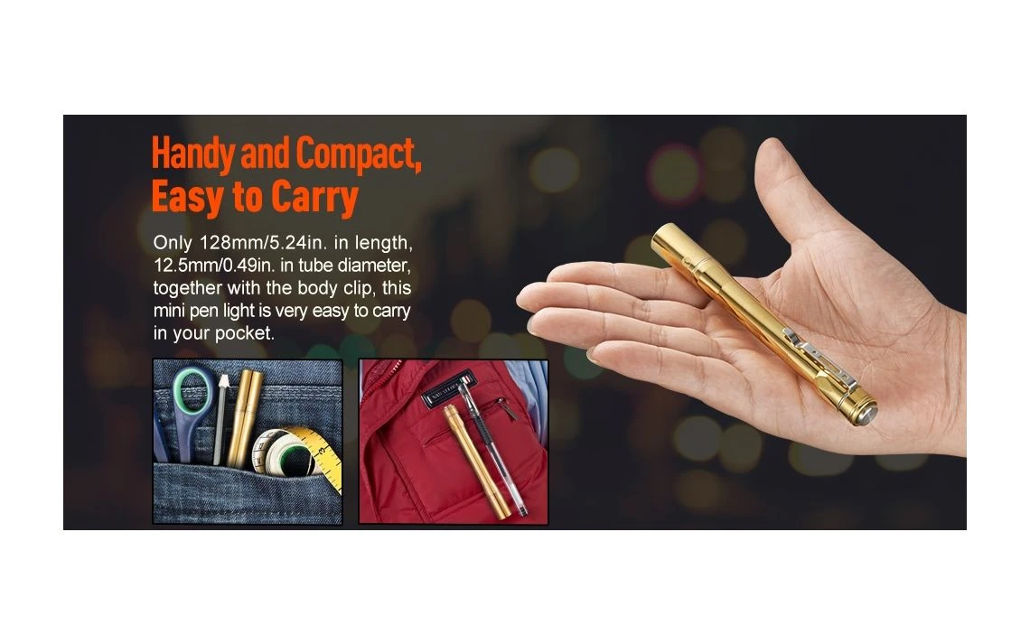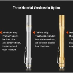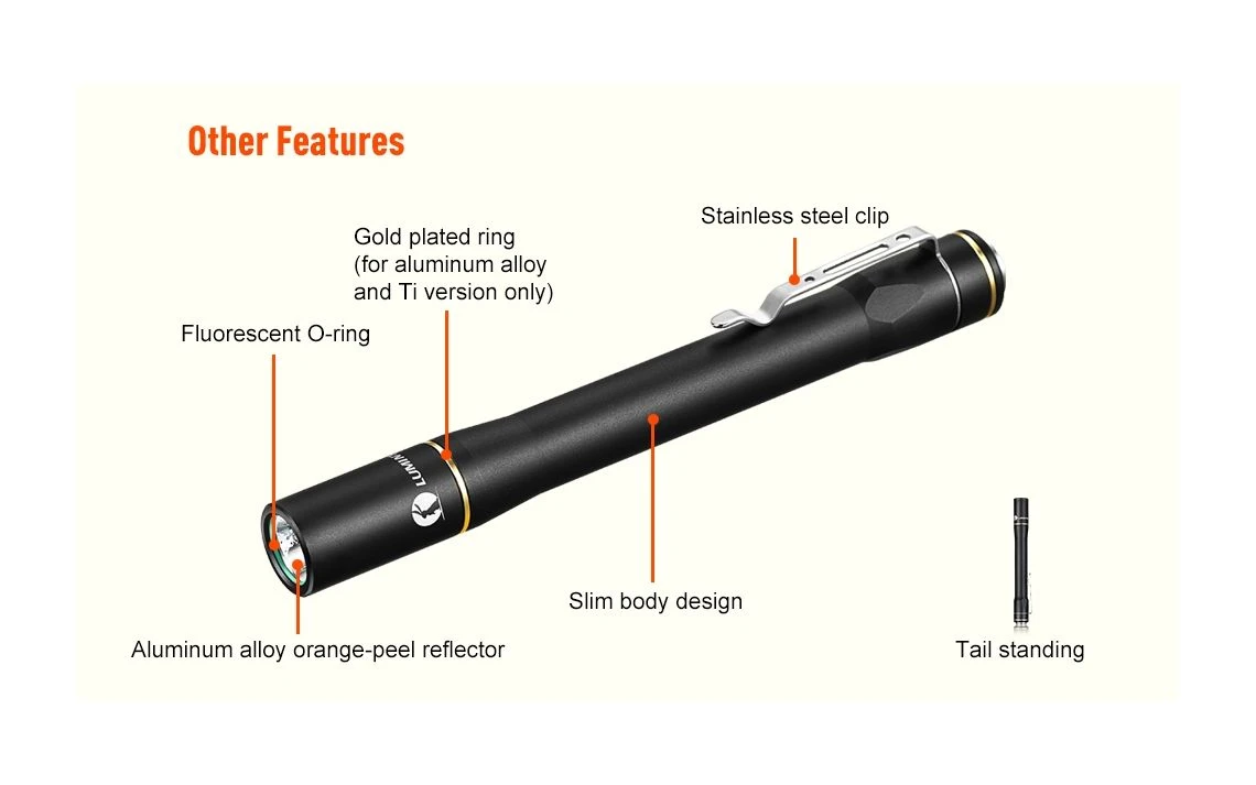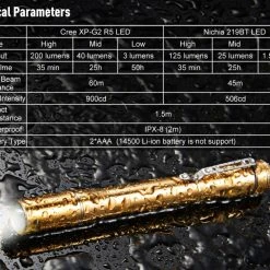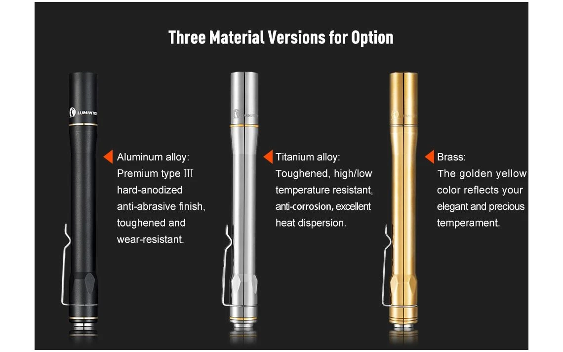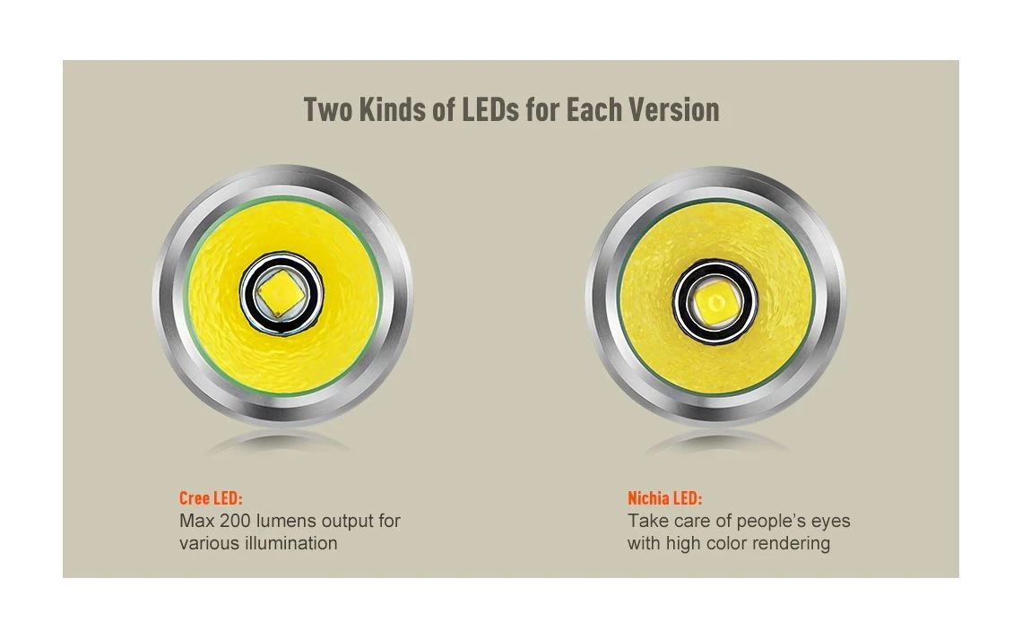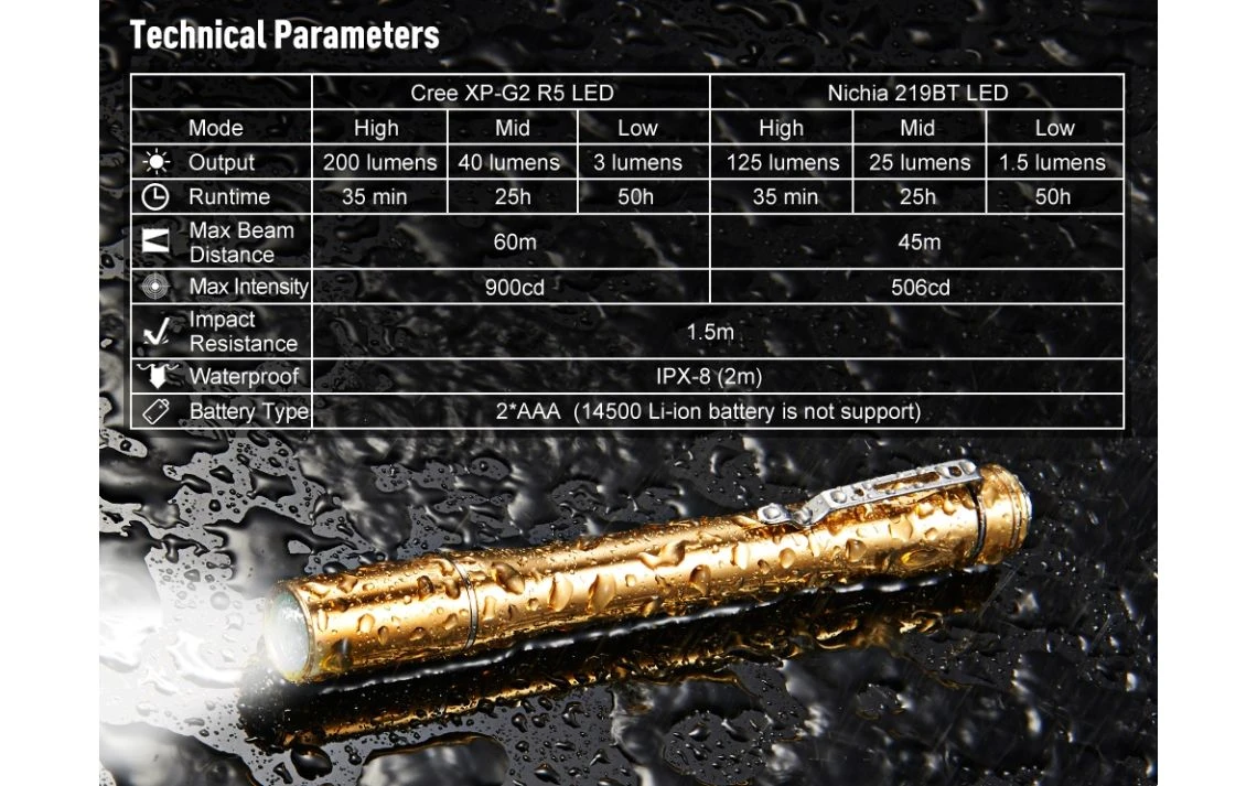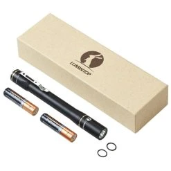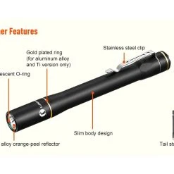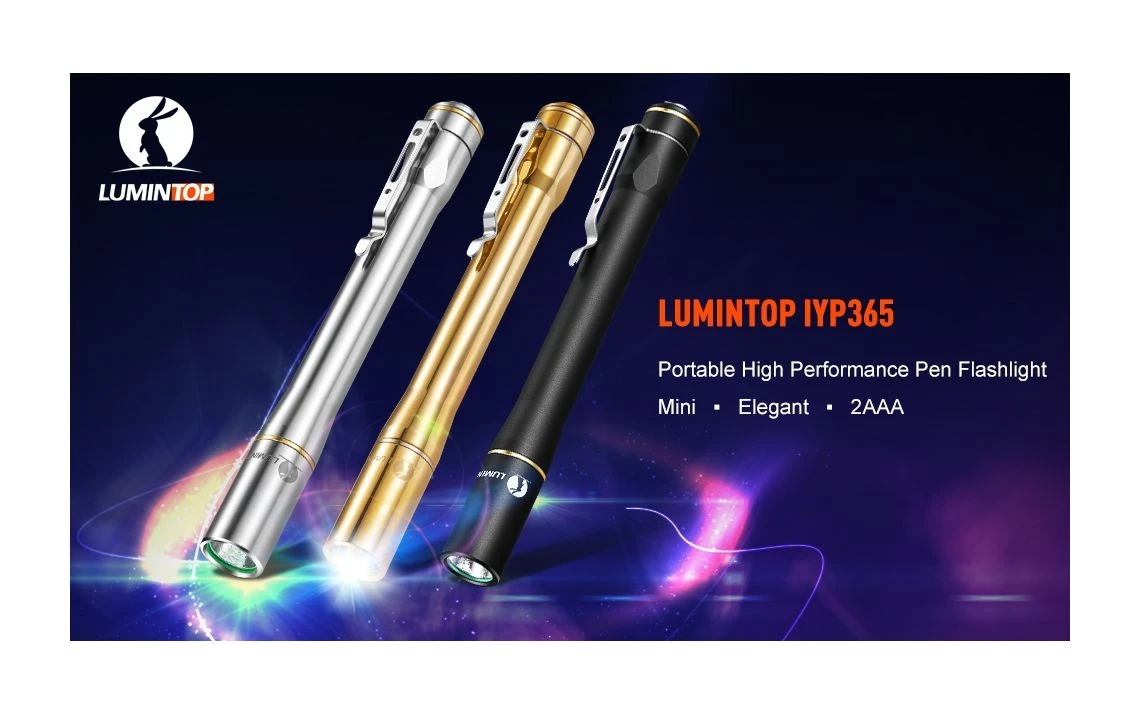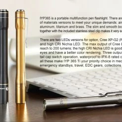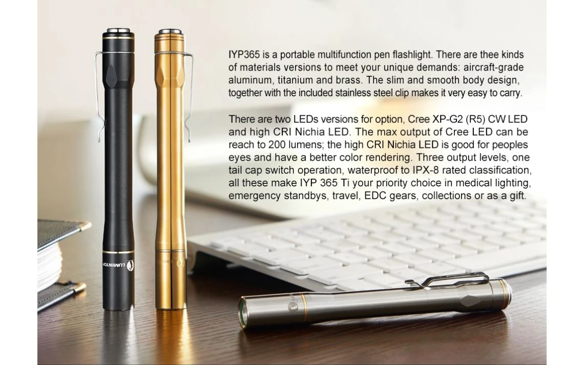 23g, 200 lumens;The Lumintop’s IYP365 penlight is an extremely sleek design, with a slim body that encases either a Cree or Nichia LED, outputting up to 200 lumens. These amazing LEDs are powered by 2 AAA batteries for up to 50 hours of runtime. Waterproof to IPX8! Select Cool option for Cree and Neutral option for Nichia.