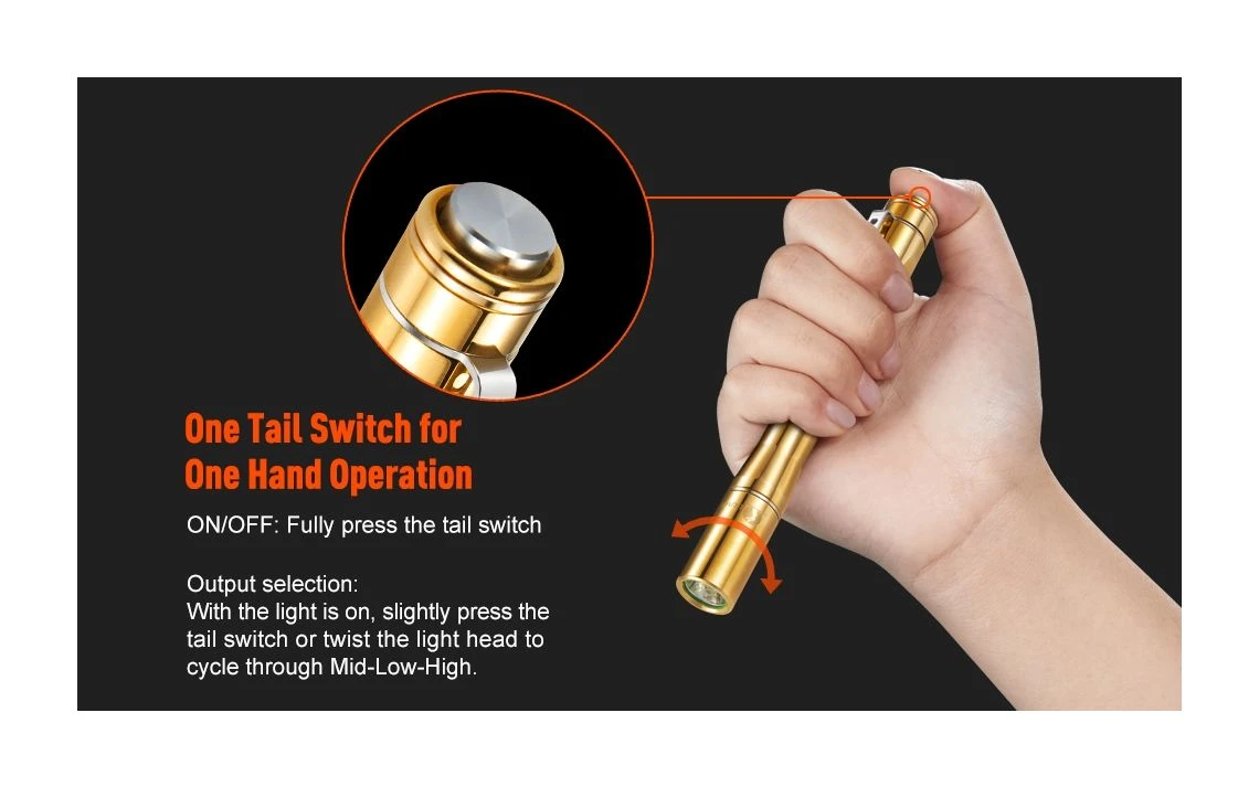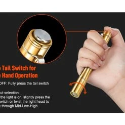 - Operation: Click the tail switch to turn on/off; when the light is on, press the switch to select brightness (Mid-Low-High); or tighten/loose the head to change modes