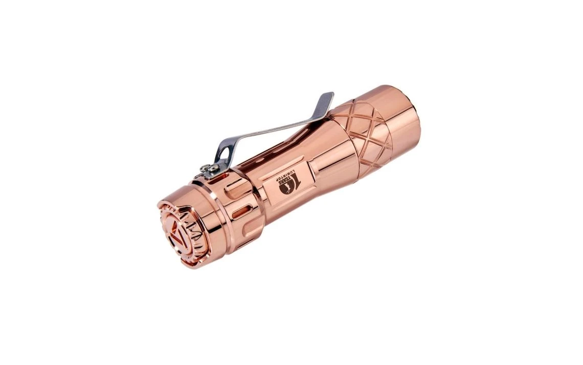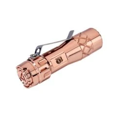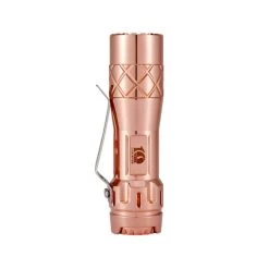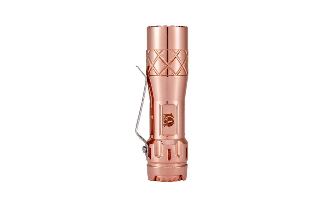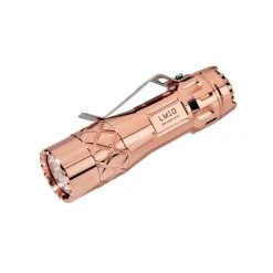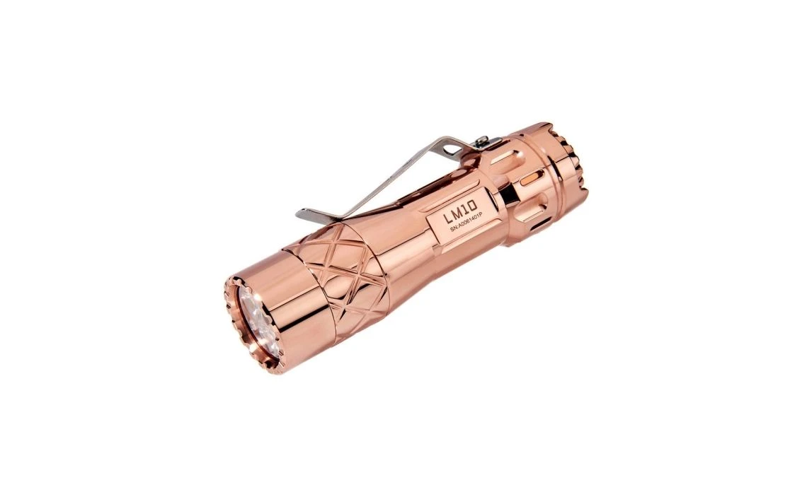 222g, 2800 Lumen:Â The Lumintop LM10 Copper version was launched as a 10th year anniversary flashlight from Lumintop. The LM10 is made of copper giving it a stunning look. It has a unique shape design and features Anduril UI. The compact stylish LM10 is powered by an included high drain flat top 18650 Li-ion battery. Clicky E-Switch and button on the tail with smooth ramping, stepped mode setting, strobe, muggle mode and more. Available in Cree XP-L HI and Nichia 219C. 3500mAh rechargeable battery included. Compact Stylish Design 10th Anniversary Flashlight!