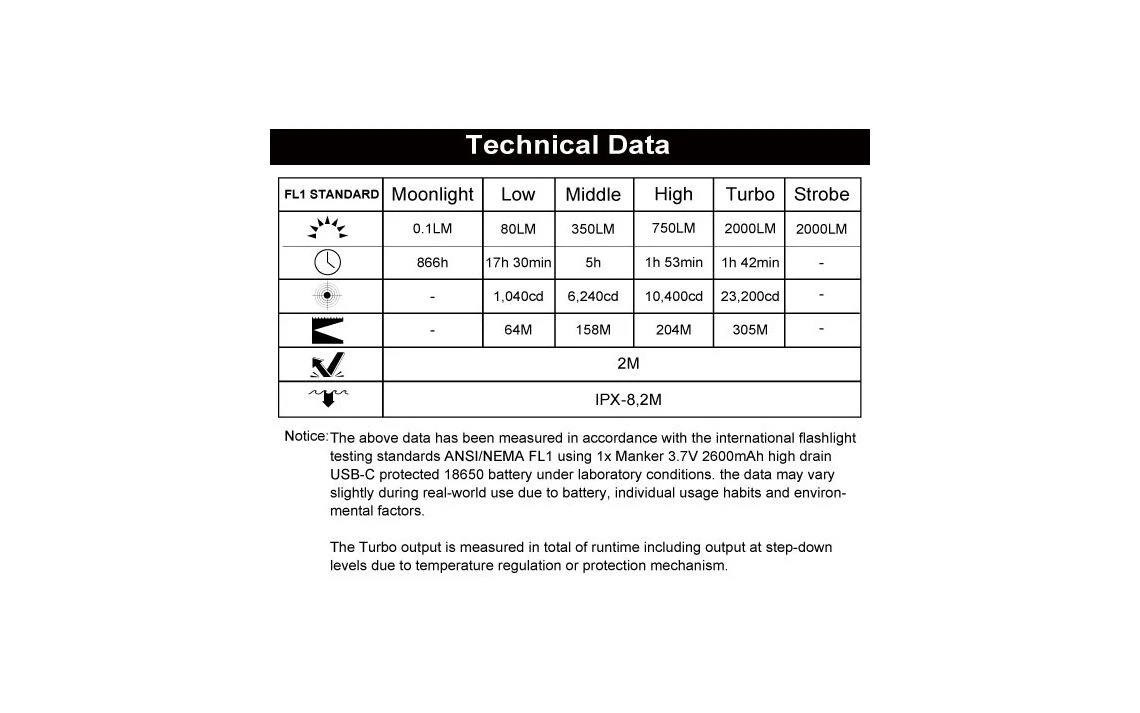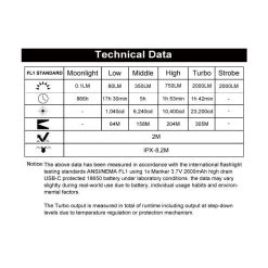 - Turbo: 2,000 Lumens – 1 H 42 Mins