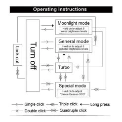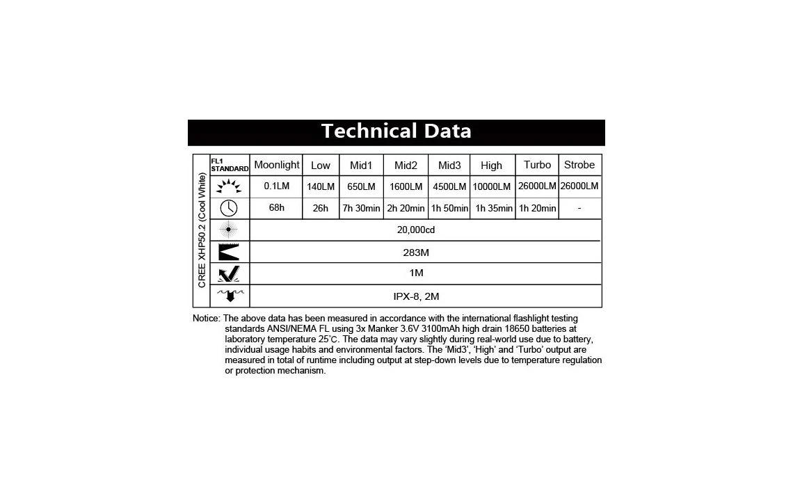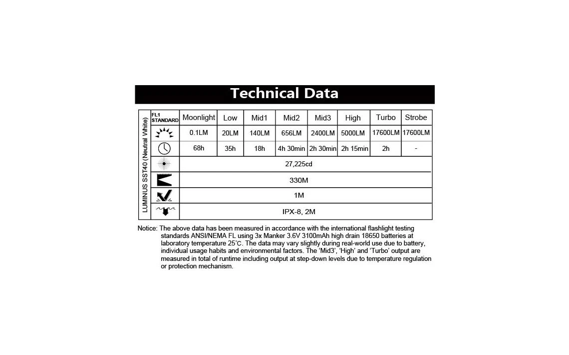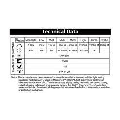 - Max beam distance: CREE – 283m / LUMINUS (CW) – 350m / LUMINUS (NW) – 330m