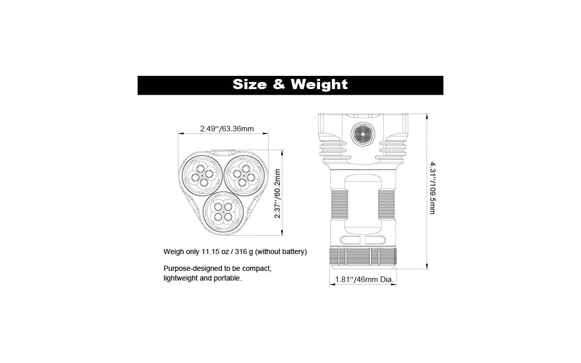 - Max output of 26,000 lumens (CREE) and max 350m beam distance (LUMINUS Cool White)