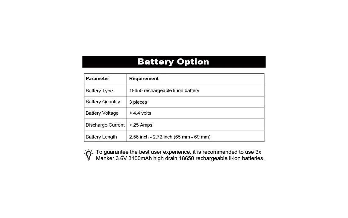- 3 x Manker 3100mAh 18650 rechargeable Li-ion battery