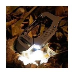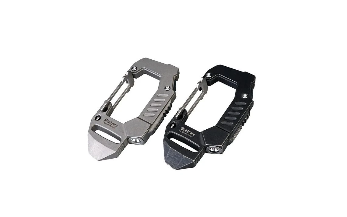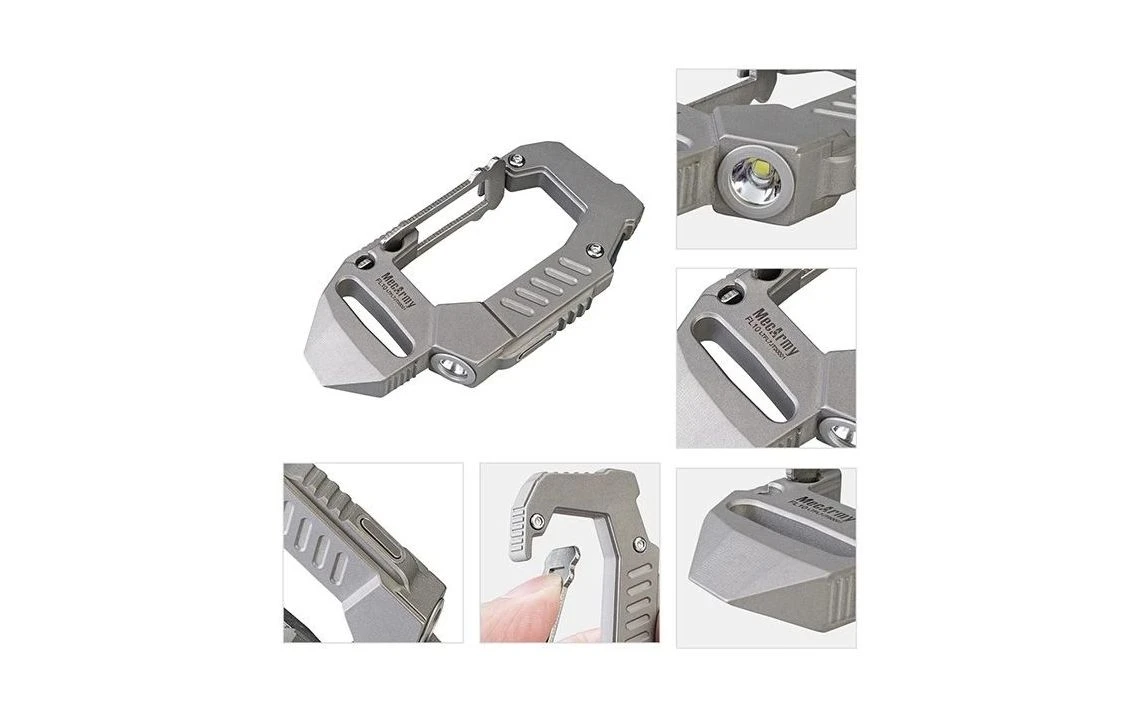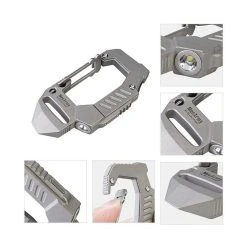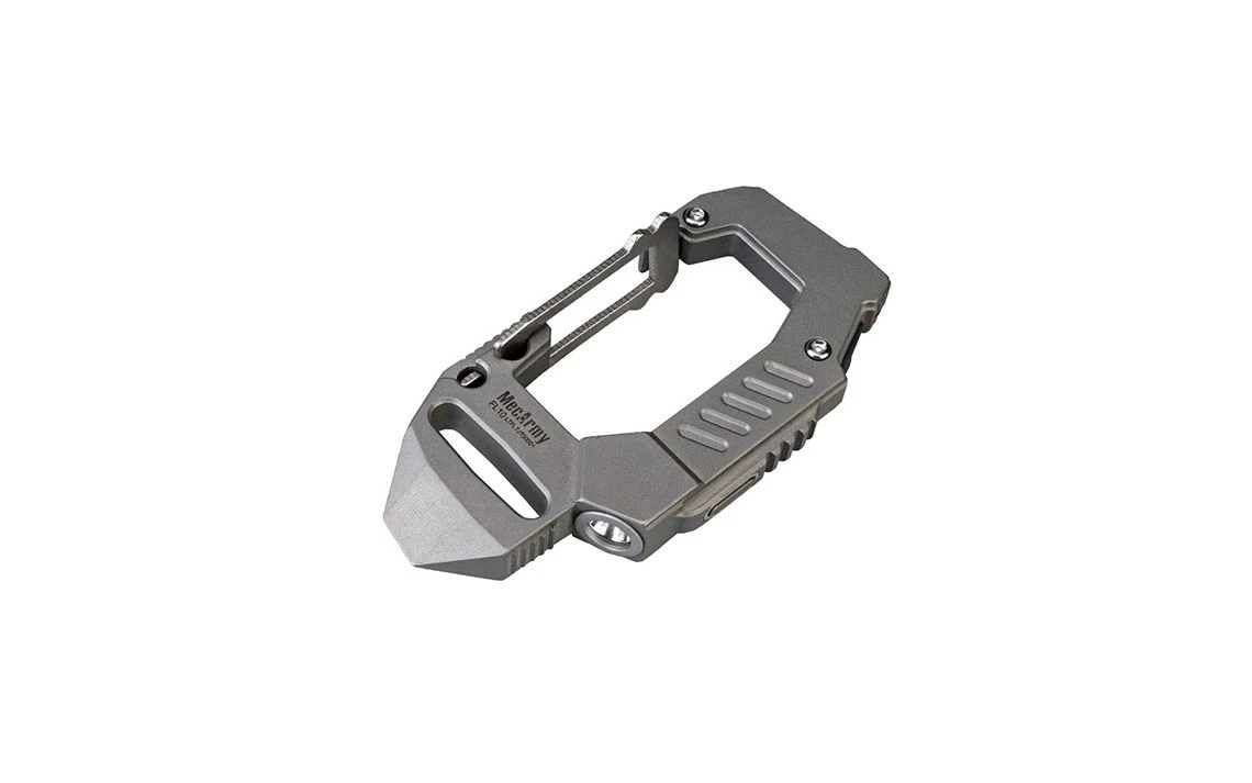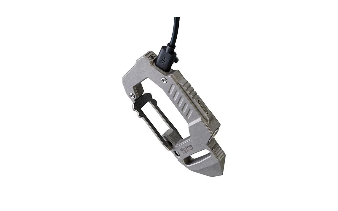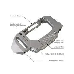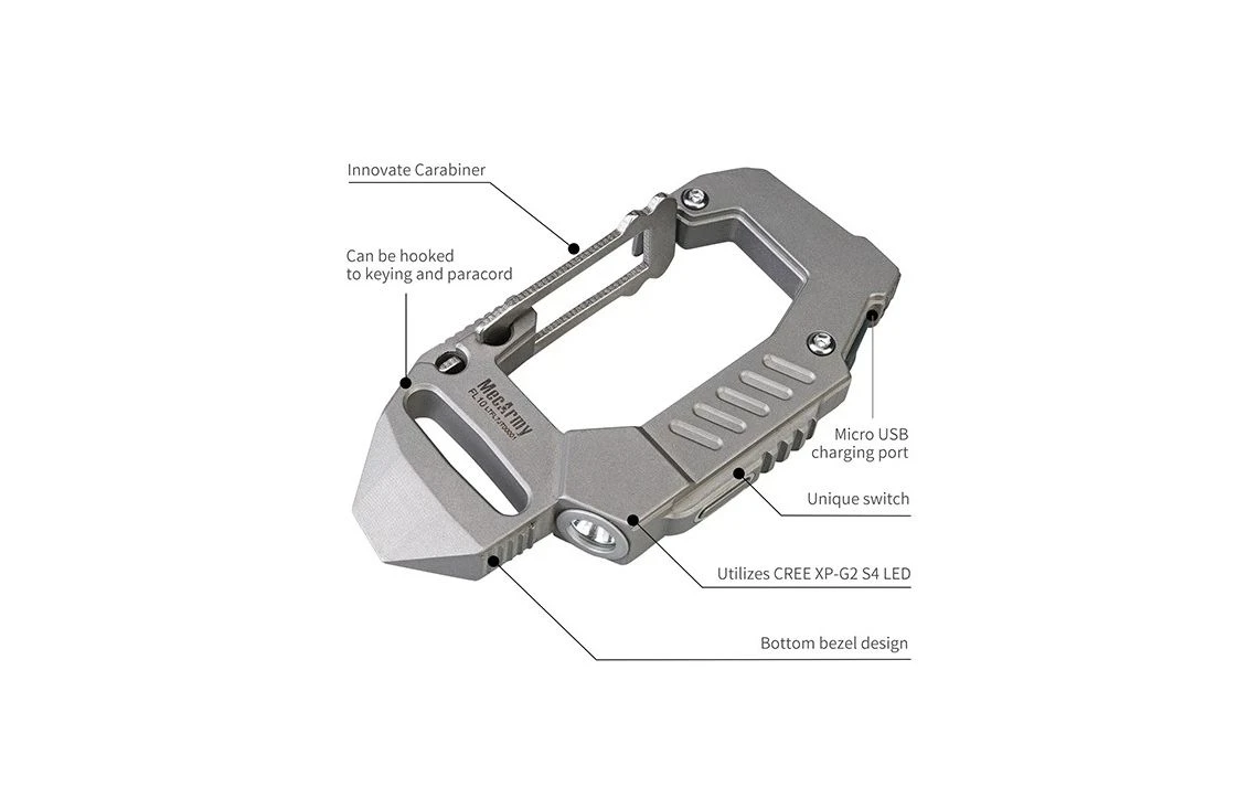 55g, 360 Lumens: The MecArmy FL10 is a multipurpose titanium carabiner light. It is made of TC4 titanium which is lightweight and durable. The FL10 features a CREE XP-G2 S4 LED which offers four brightness levels and a strobe mode with a max output of 360 lumens. This is a very versatile tool and can be used as a carabiner, light, pry bar, box opener, bottle opener and self defence tool. The FL10 runs off a built-in rechargeable 100mAh lithium polymer battery which is Micro USB rechargeable and features a charging indicator. Multipurpose carabiner flashlight.