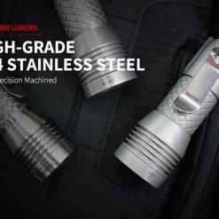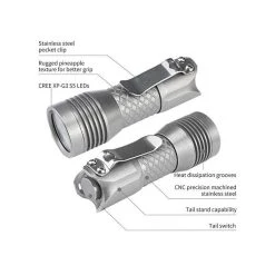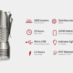 122g, 2000 Lumens: The MecArmy PS16 is a stainless steel EDC torch with a max output of 2,000 lumens. It uses four CREE XP-G3 S5 LEDs and offers three levels of brightness plus a strobe mode. The PS16 comes with a Micro USB rechargeable 16340 Li-ion battery but is also compatible with 18350 Li-ion batteries which are needed to reach the max output of 2,000 lumens. The PS16 is compact in size which makes it a great everyday carry torch and it also features a stainless steel pocket clip and a lanyard for more versatility. Other features of this torch include the head dissipation grooves, trident tail section for breaking glass and it’s IPX7 waterproof rated. The PS16 is made of high grade 304 stainless steel and is available in three finishes – Sandblasted, polished or stonewashed. USB- rechargeable 16340 Li-ion battery included.