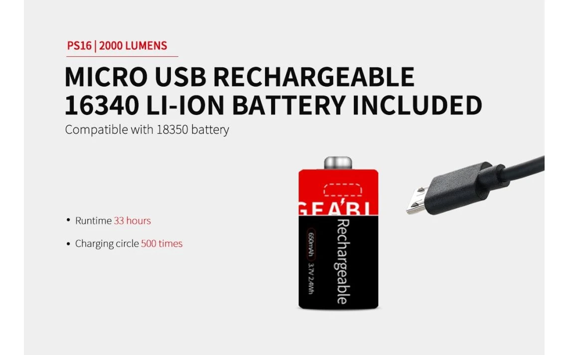 - 1 x USB rechargeable 650mAh 16340 Li-ion battery