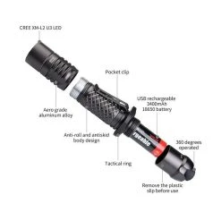 - Runs off a USB rechargeable 3400mAh 18650 Li-ion battery (included)