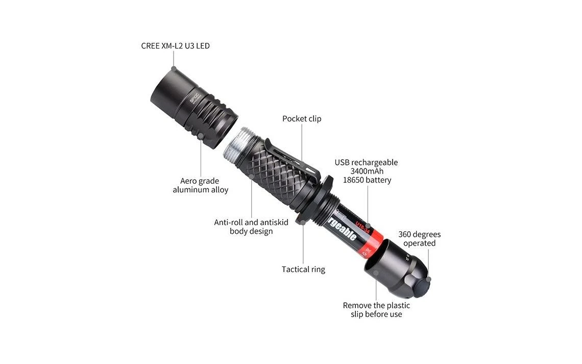 - 1 x Micro USB rechargeable 3400mAh 18650 Li-ion battery