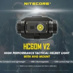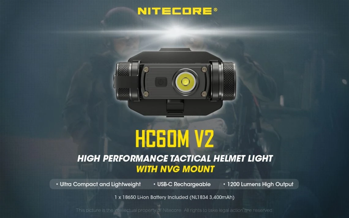 132g, 1,200 Lumens: The Nitecore HC60M V2 is a high performance tactical helmet light that takes everything we love about the original HC60M and makes it even better. The HC60M V2 produces a powerful max output of 1,200 lumens and 130m beam distance. With the included NVG mount this is specially designed for law enforcement, military, firefighting, search and rescue. The HC60M V2 utilises an OSRAM P9 LED and offers wide floodlight illumination of up to 100°. This headlamp offers 5 brightness levels as well as a strobe, beacon and SOS mode so its perfect for a variety of situations. The HC60M V2 runs off an included 3400mAh 18650 Li-ion battery and is rechargeable via the USB-C port for fast charging. The elastic and breathable headband that comes with the HC60M V2 makes for a comfortable and secure fit and the headlamp is 180° adjustable so you can get the light in the exact position you need it. Other features of the HC60M V2 include the power indicator, memory function, IPX7 waterproof rating and durable build quality. 3400mAh 18650 rechargeable Li-ion battery included.