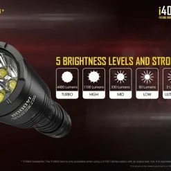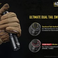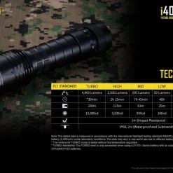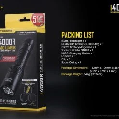 135g, 4400 Lumens : The Nitecore i4000R is Future Oriented 21700 intelligent tactical LED torch. It features Strobe ready technology for quick access with one-handed operation. i4000R runs on included 21700 Li-ion 5000mAh rechargeable battery and can power max output of 4400 lumens with peak distance of 230 metres. USB Type-C fast charging, memory function, dual LED indicators, included NTH20 hard tactical holster and independently controlled LED design are few cool features. Strobe Ready Bright tactical rechargeble LED torch!