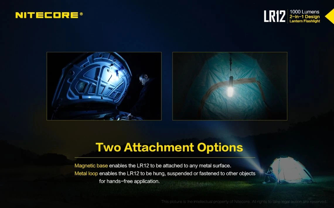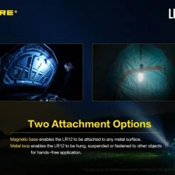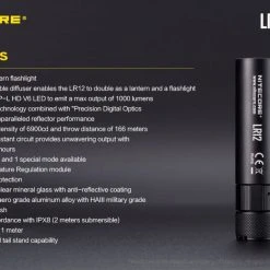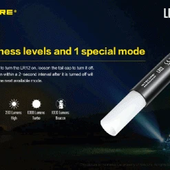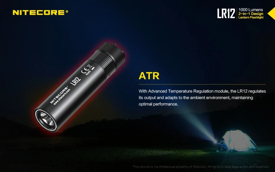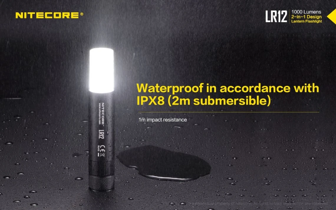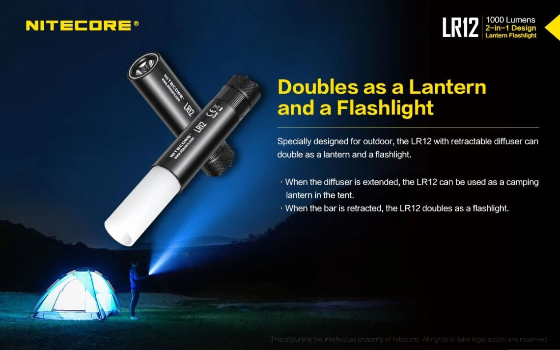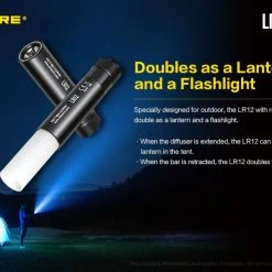 78.52g, 1000 lumen: The Nitecore LR12 is a portable powerful and versatile LED lantern. It is equipped withCREE XP-L HD V6 and powered by 18650 or CR123A Li-ion battery. The multiple hands-free options add to the overall versatility of this 2-in-1 lantern and flashlight. 2-in-1 lantern and flashlight