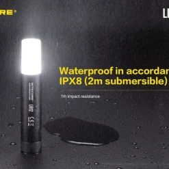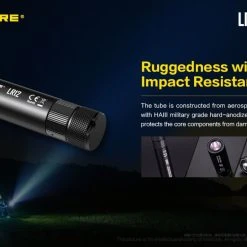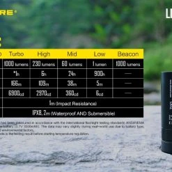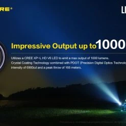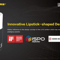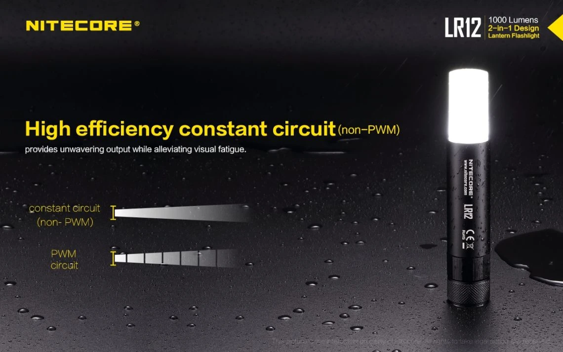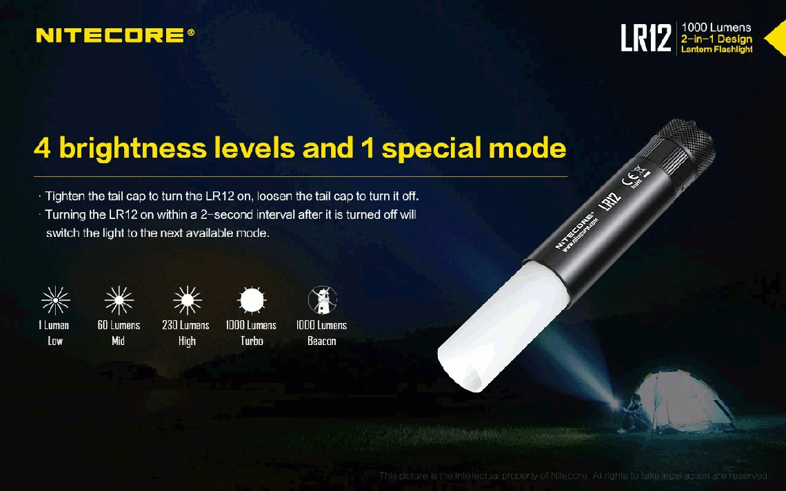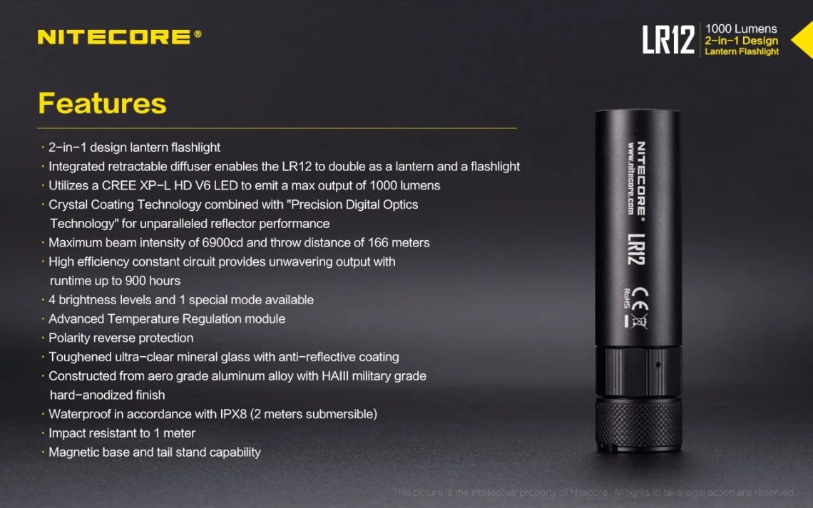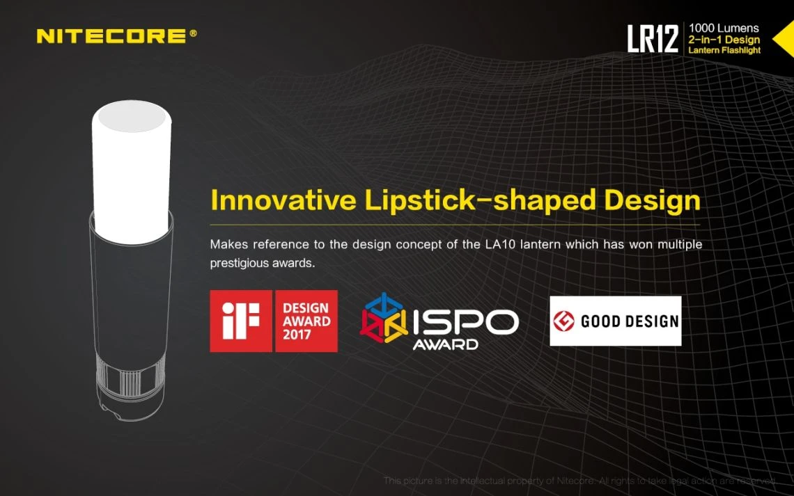78.52g, 1000 lumen: The Nitecore LR12 is a portable powerful and versatile LED lantern. It is equipped withCREE XP-L HD V6 and powered by 18650 or CR123A Li-ion battery. The multiple hands-free options add to the overall versatility of this 2-in-1 lantern and flashlight. 2-in-1 lantern and flashlight