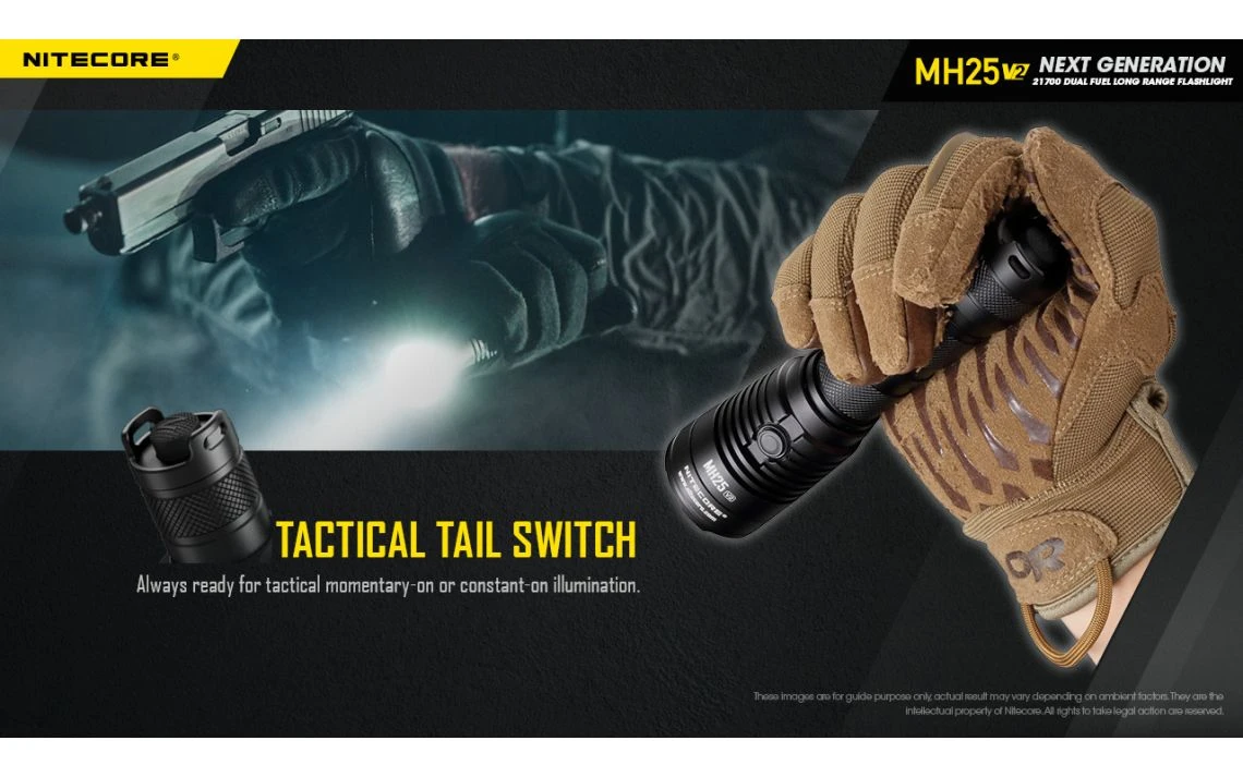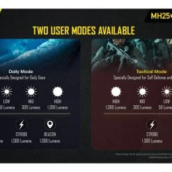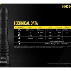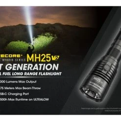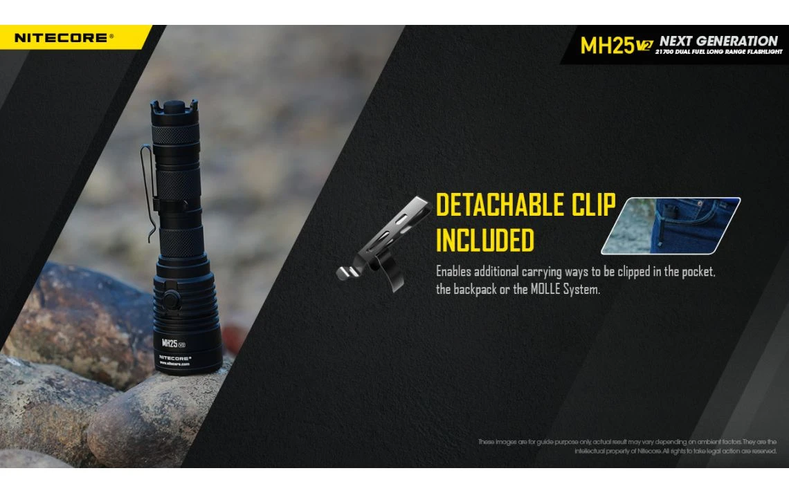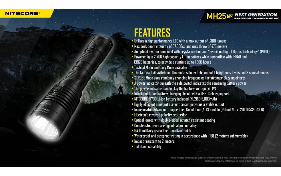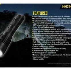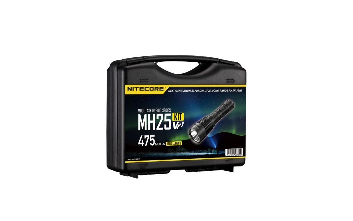 137g, 1,300 Lumens: The Nitecore MH25 V2 is a long range tactical torch that produces a max output of 1,300 lumens and a 475m beam distance. It utilises a high performance LED to offer 4 brightness levels as well as a strobe, beacon and SOS mode. The MH25 V2 runs off an included 5000mAh 21700 Li-ion battery and is rechargeable via the USB-C port. You can also use 18650 or 2 x CR123 batteries with this torch when using the included battery adapter. Featuring both a tail switch and a metal side switch, you can easily access all the different modes and can use it in daily or tactical mode. It also has a standard 25.4mm tube diameter so it is compatible with most standard weapon mounts as well as specific filters and remote switches (see related products). Other features of this powerful torch include the tail stand capability, IP68 waterproof rating, 2m impact resistance, memory function, temperature regulation and a power indicator. Long range tactical hunting kit!