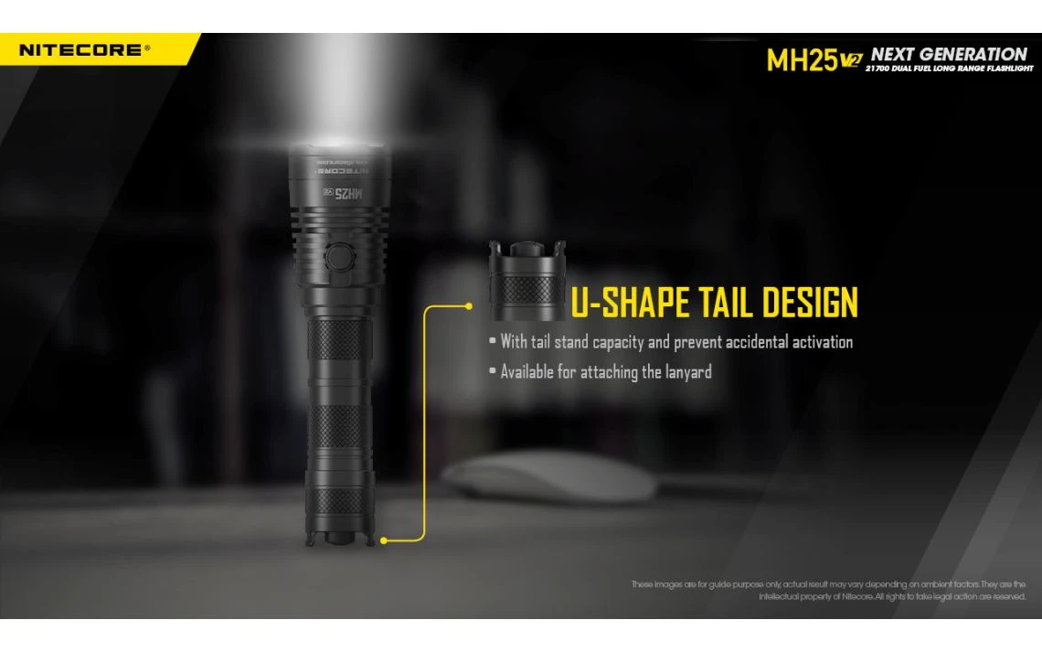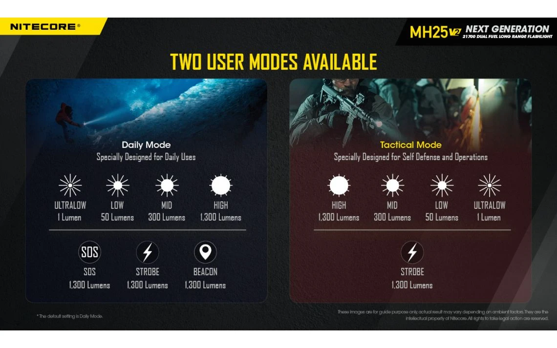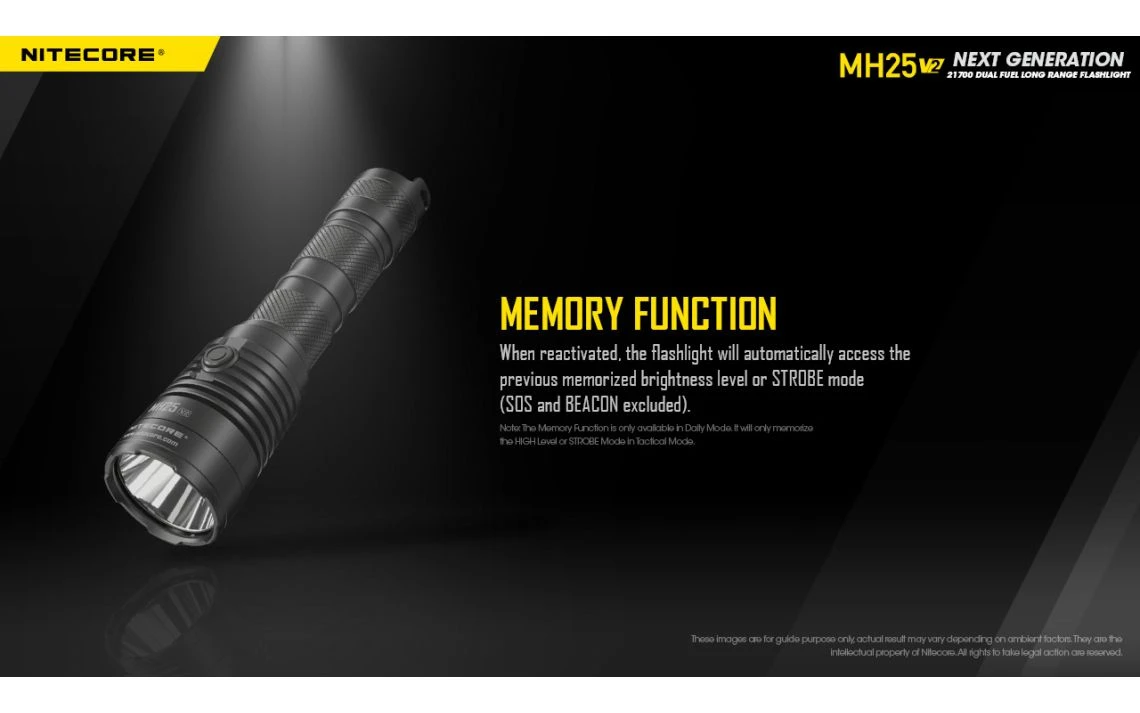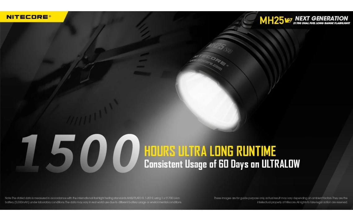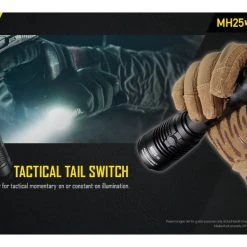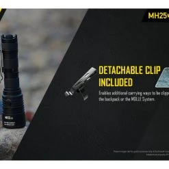 137g, 1,300 Lumens: The Nitecore MH25 V2 is a long range tactical torch that produces a max output of 1,300 lumens and a 475m beam distance. It utilises a high performance LED to offer 4 brightness levels as well as a strobe, beacon and SOS mode. The MH25 V2 runs off an included 5000mAh 21700 Li-ion battery and is rechargeable via the USB-C port. You can also use 18650 or 2 x CR123 batteries with this torch when using the included battery adapter. Featuring both a tail switch and a metal side switch, you can easily access all the different modes and can use it in daily or tactical mode. It also has a standard 25.4mm tube diameter so it is compatible with most standard weapon mounts as well as specific filters and remote switches (see related products). Other features of this powerful torch include the tail stand capability, IP68 waterproof rating, 2m impact resistance, memory function, temperature regulation and a power indicator. Long range tactical hunting kit!