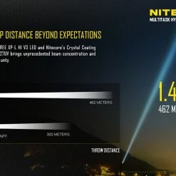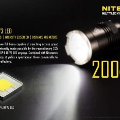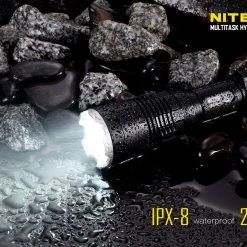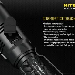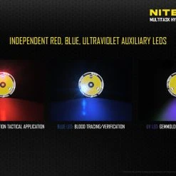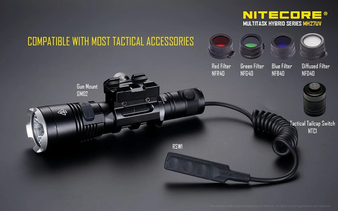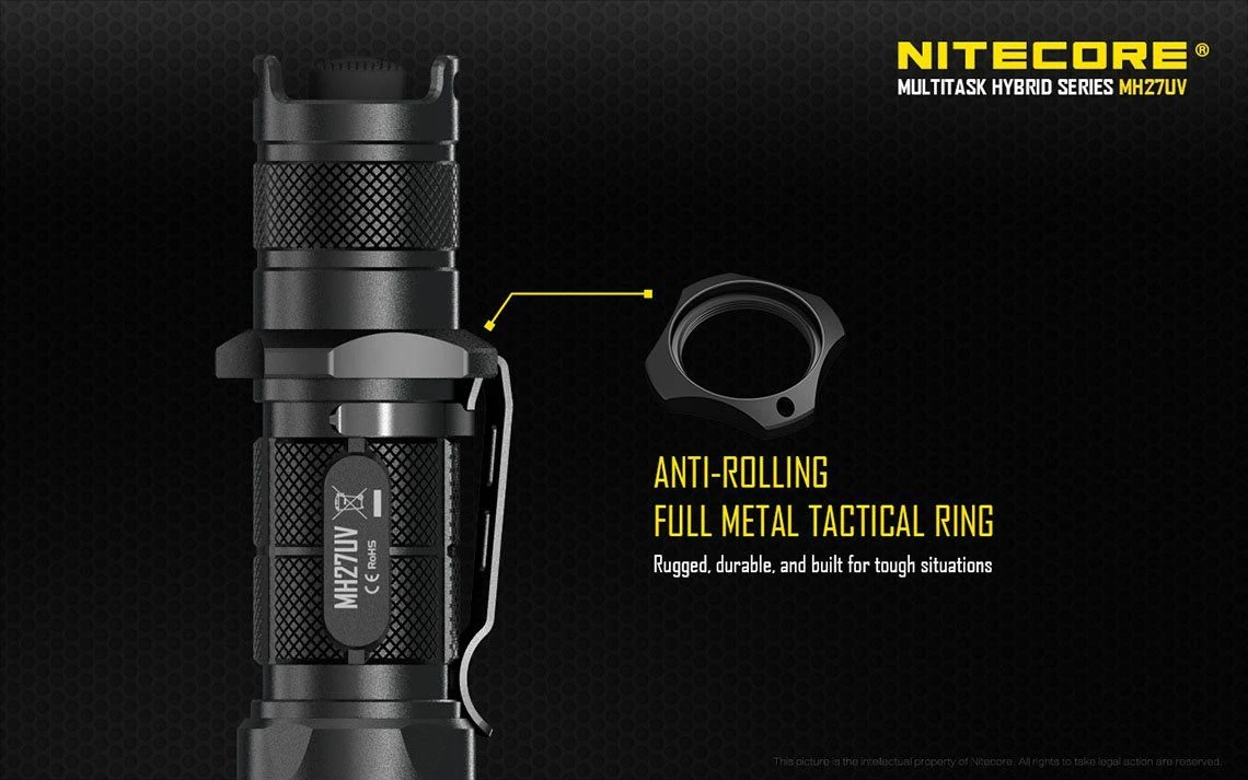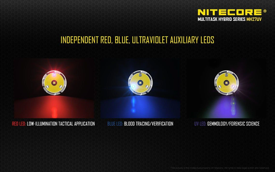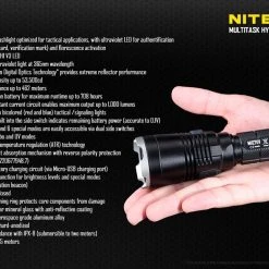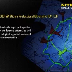170g, 1000 Lumens, 53,500cd, 500mW 365nm UV: Nitecore have modified the MH27 by replacing the Green LED with a UV LED. USB rechargeable and 1000 lumens of long range (462m) white light from the CREE XP-L HI V3 LED. UV, Red and blue secondary outputs and multiple special modes including strobe, SOS, police mode and more. Three buttons allow for easy control and all modes can be memorised. Super versatile powerful rechargeable tactical torch with UV.