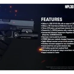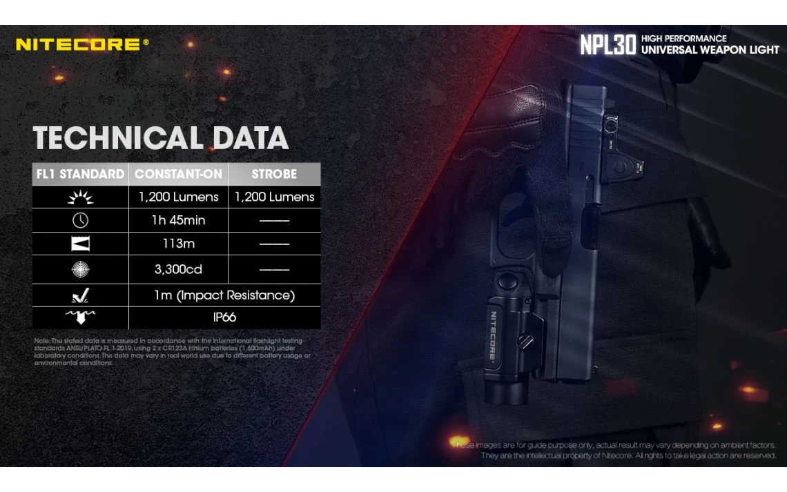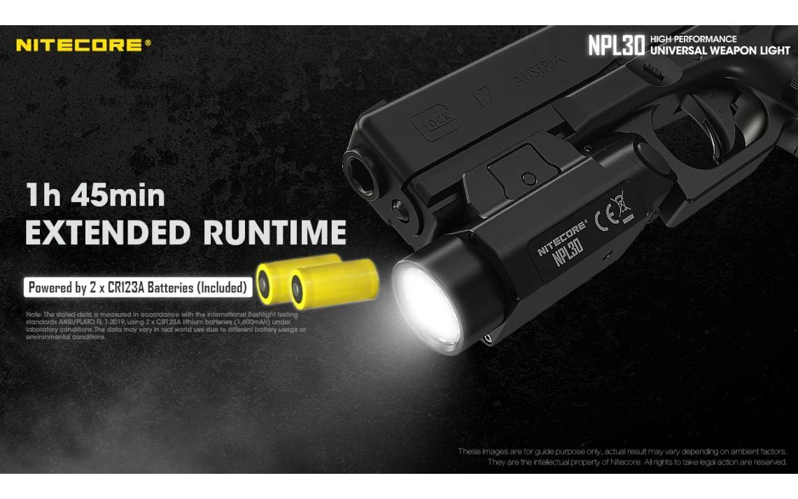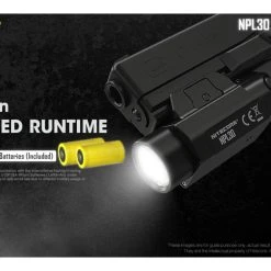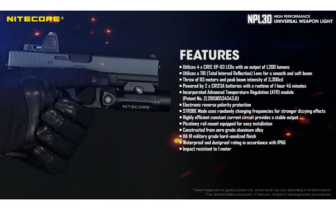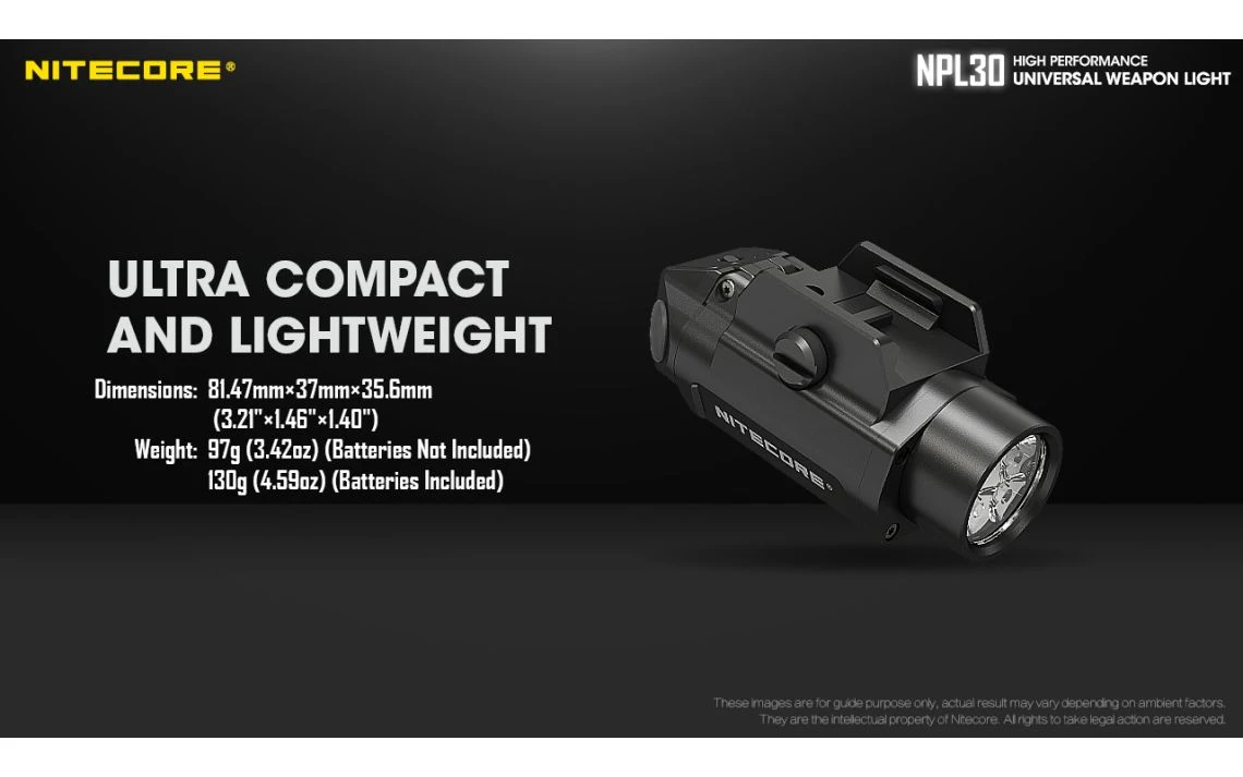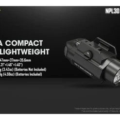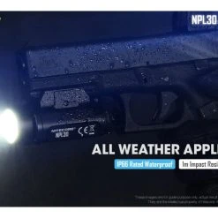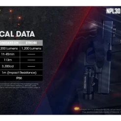 97g, 1,200 Lumens: The Nitecore NPL30 is a high performance universal weapon light that produces an output of 1,200 lumens. It utilises 4 x CREE XP-G3 LEDs and has one brightness level as well as a strobe mode. The NPL30 has ambidextrous activation so you can activate it from both sides for momentary on, constant on and strobe. The NPL30 has a standard Picatinny rail mount for easily installation. The NPL30 is powered by 2 x CR123A batteries and offers a 1 H 45 Min extended runtime. Other features of this weapon light include the advanced temperature regulation, electronic reverse polarity protection, IP66 waterproof rating and 1m impact resistance. 2 x CR123A batteries included.