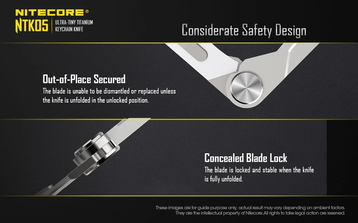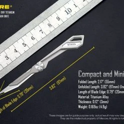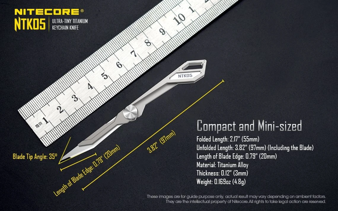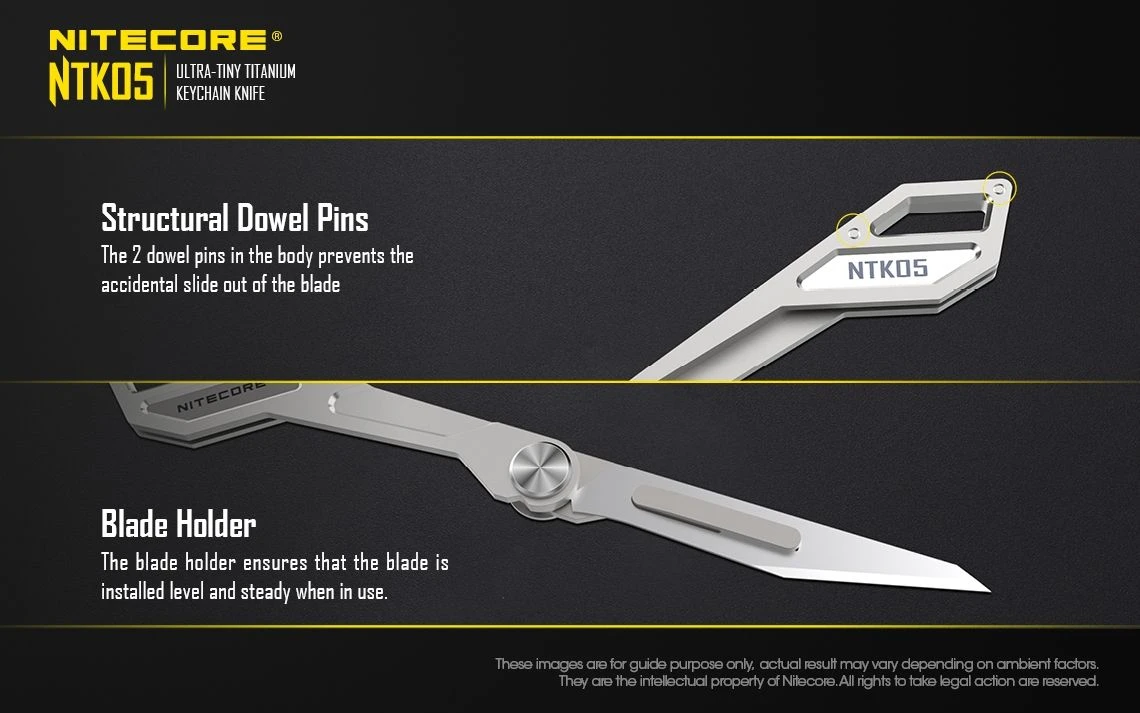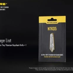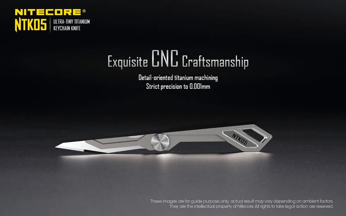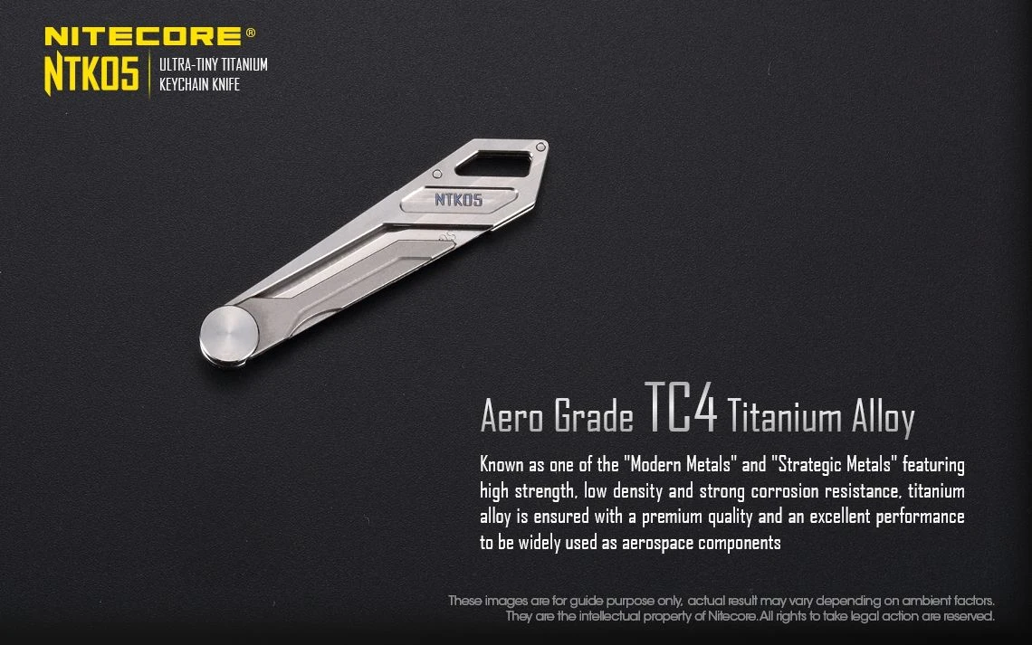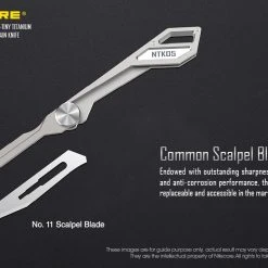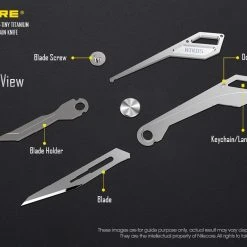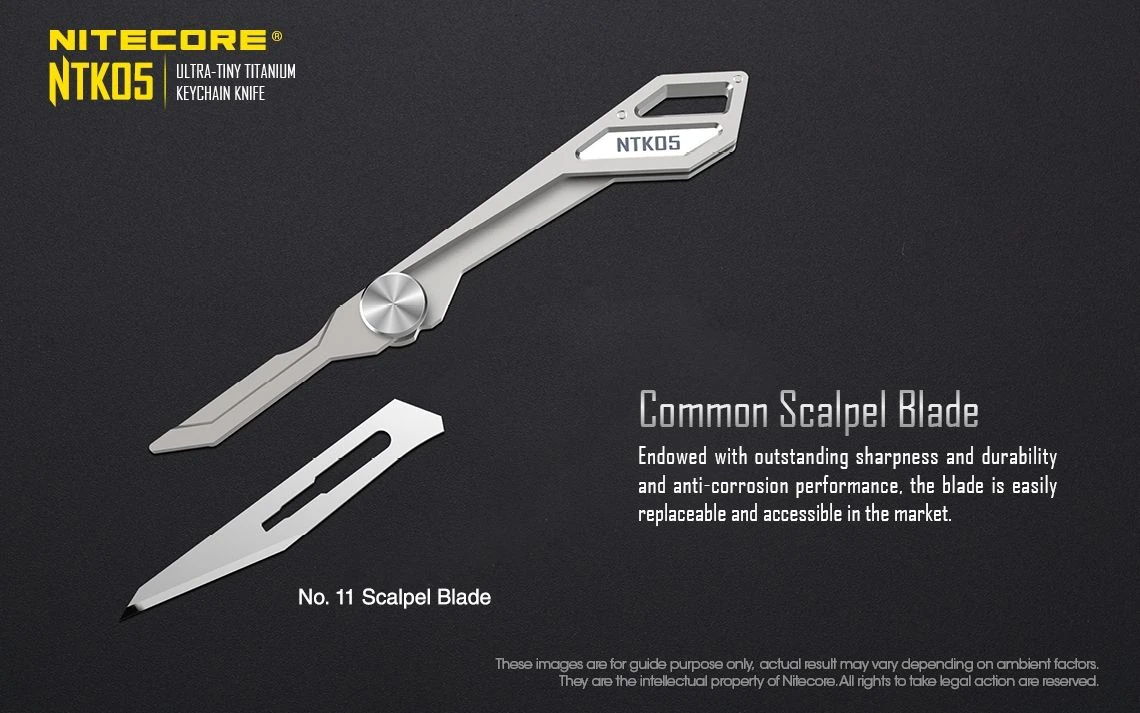 The Nitecore NTK05 is a Ultra Tiny titanium multi-purpose keychain scalpel. It is mini-sized, compact and lightweight perfect for everyday carry. It has an easy blade screw for replacing the blade.