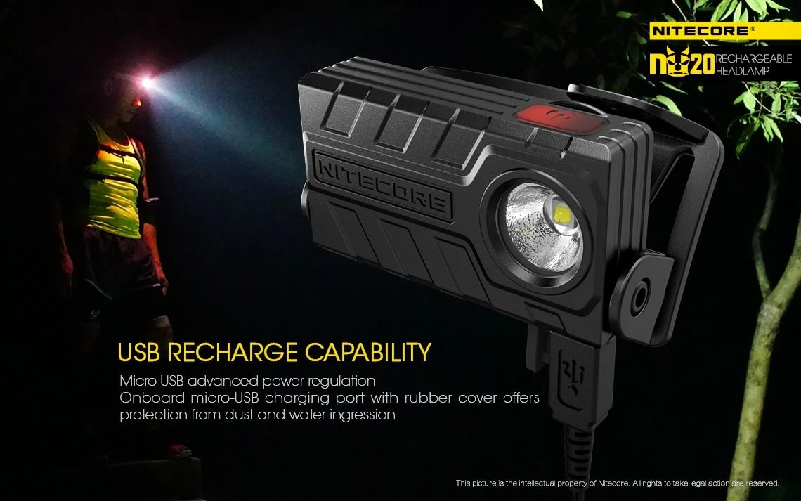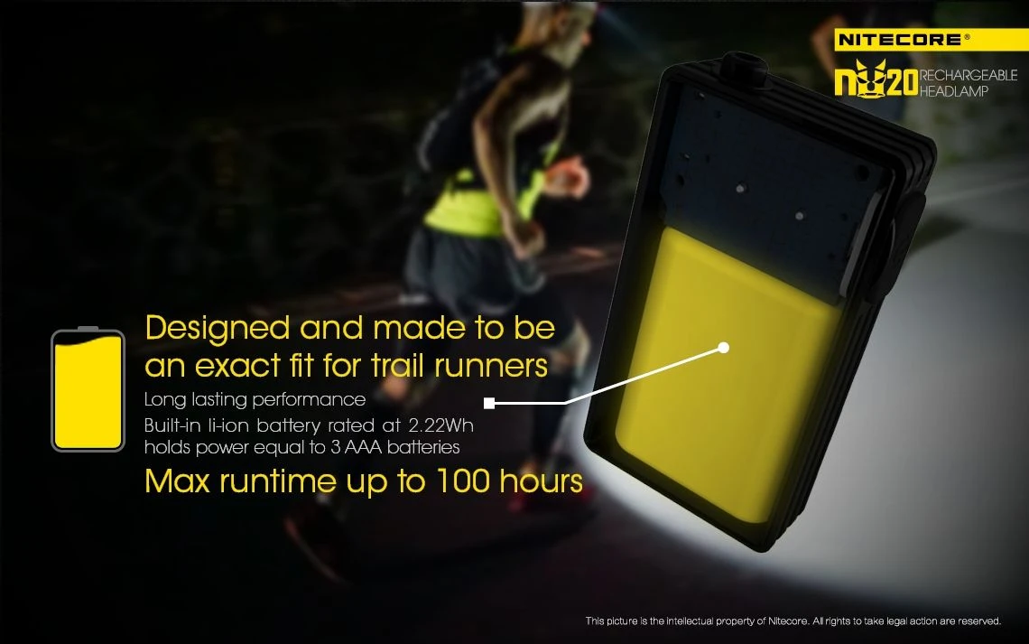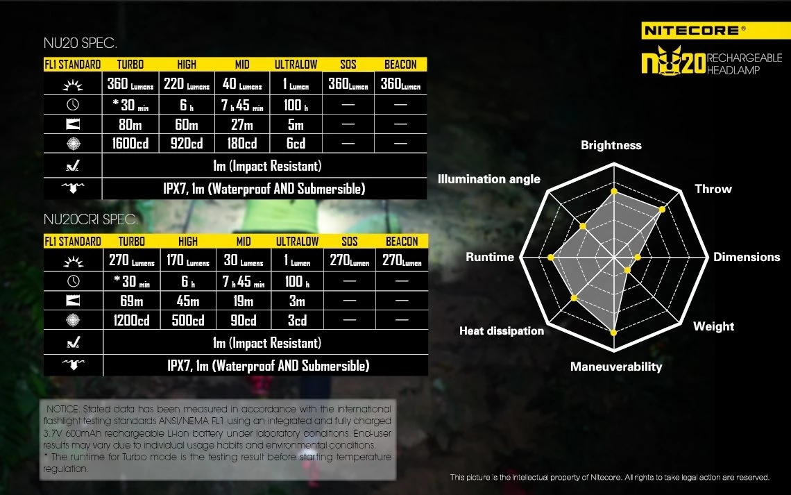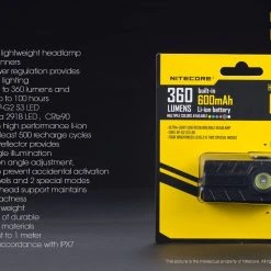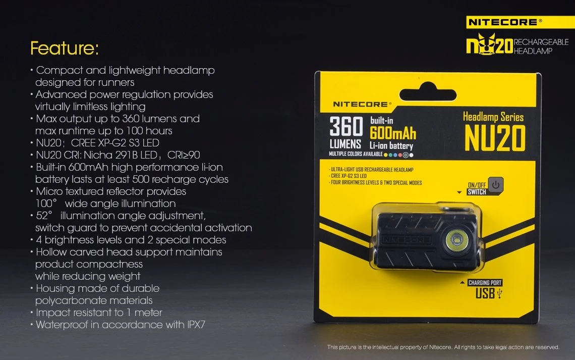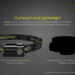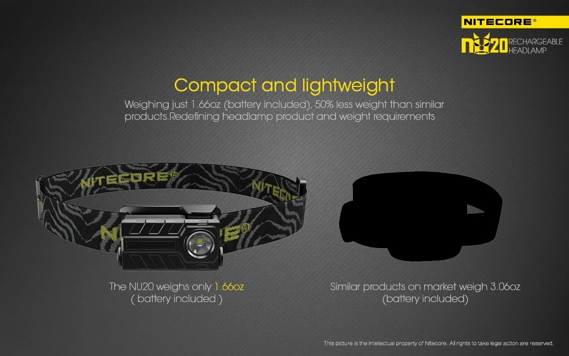 47g, 360 lumen: Nitecore NU20 LED Headlamp is one of Nitecore’s smallest and most efficient headlamps to date. Equipped with a powerful CREE XP-G2 S3 LED, this tiny illuminator can produce up to 360 Lumens of brilliant white light. Compact lightweight headlamp!