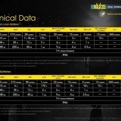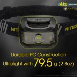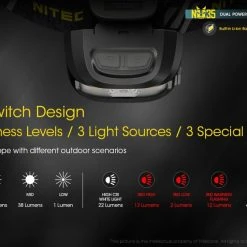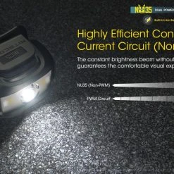 79.5g, 460 Lumens: The Nitecore NU35 is a dual powered working headlamp that has a max output of 460 lumens. The NU35 has a built-in 590mAh Li-ion battery as well as compatibility to insert an additional 3 x AAA batteries for longer run times. With the dual batteries you can get up to 10 hours of run time on high mode. The built-in battery can be recharged via the included USB-C charging cable and you can also still access turbo mode while the headlamp is charging. This headlamp is ideal for work environments such as maintenance, construction, emergency, search and rescue as well as for outdoor activities and camping. The NU35 uses TrueVision technology which eliminates the central hotspot and creates a consistent and balanced light. The main light source of the NU35 gives you 4 levels of brightness from 1 lumen to 460 lumens. The NU35 also features an auxiliary red light which is independently controlled and is useful for protecting your night vision as well as the auxiliary high CRI white light for short-range illumination. Other features of this headlamp include its lightweight headband, power indicator, durable construction, IP66 dustproof and waterproof rating and 1 metre impact resistance. 4 Brightness Levels – 3 Light Sources – 3 Special Modes