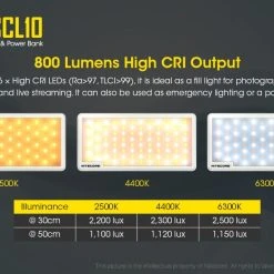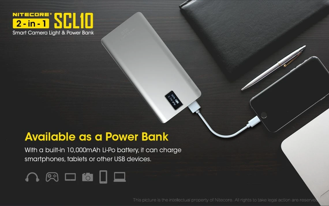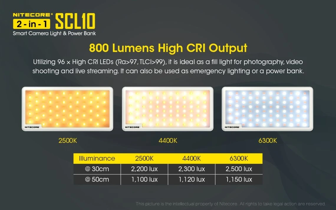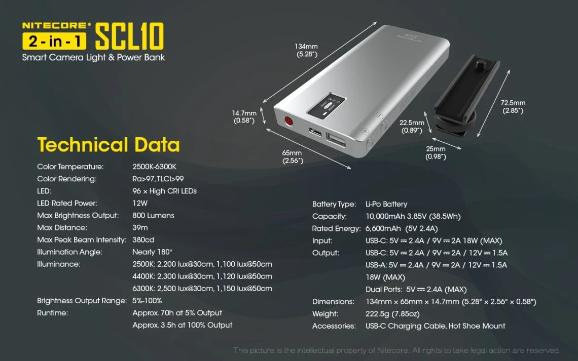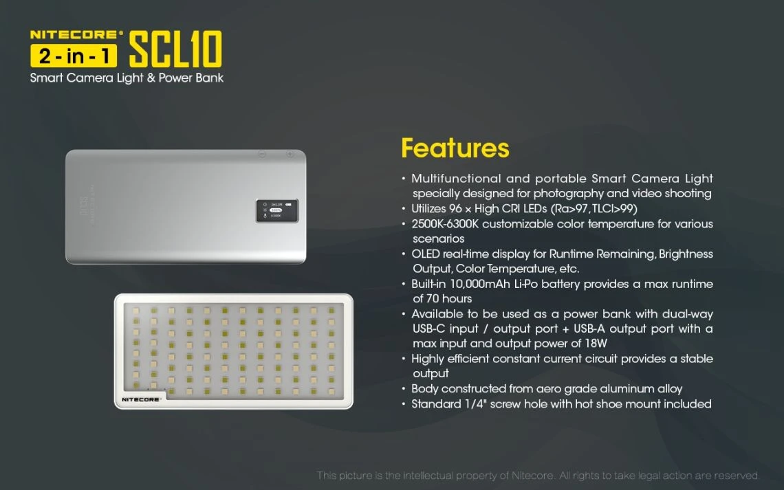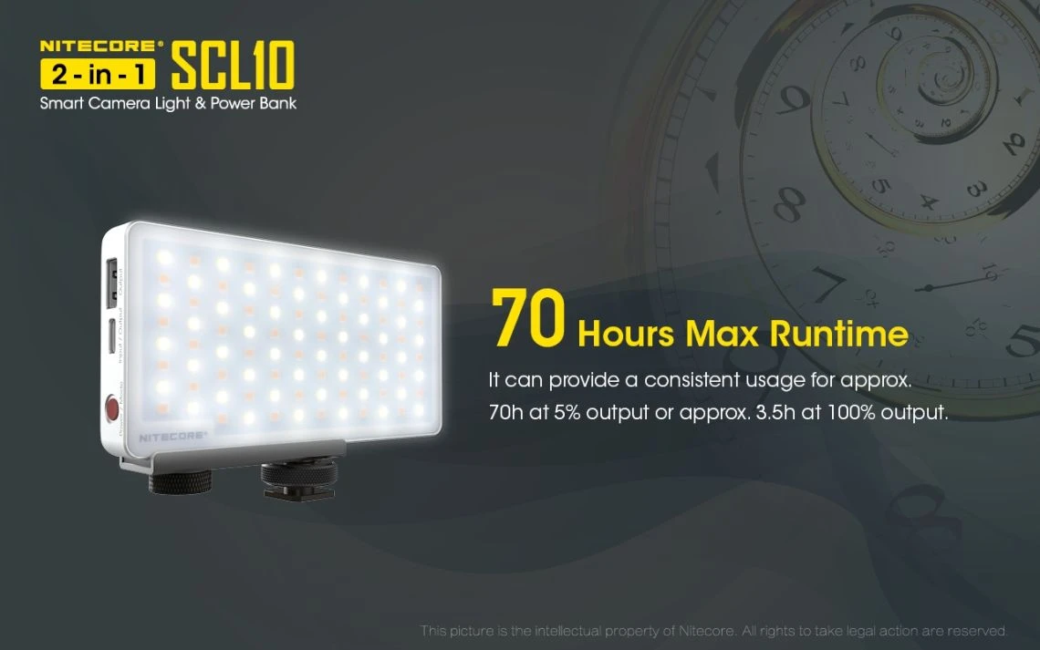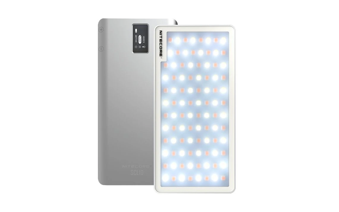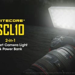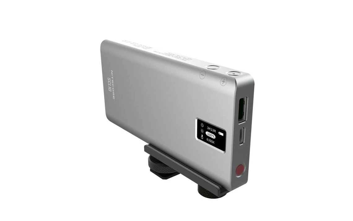 222.5g: The Nitecore SCL10 is a versatile smart camera light that also functions as a power bank. The SCL10 has 96 high CRI LEDs which give you customisable colour temperature from 2500K to 6300K as well as adjustable brightness from 5-100%. This camera light also gives you nearly 180° illumination angle make it ideal as a fill light for photography, video shooting and live steaming. The SCL10 has a built-in 10,000mAh Li-Po battery offering up to 70 hours of runtime or the ability to charge your torches, phone and other electronic devices via the USB-C and USB-A outputs. The SCL10 also features a real-time OLED display which displays a variety of information including, runtime remaining, brightness, colour temperature, battery level, output power and more. This light has a standard ¼” screw hole with an included hot shoe mount which makes it easy for attaching to your camera. Adjustable brightness and colour temperature.