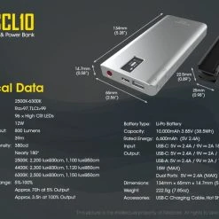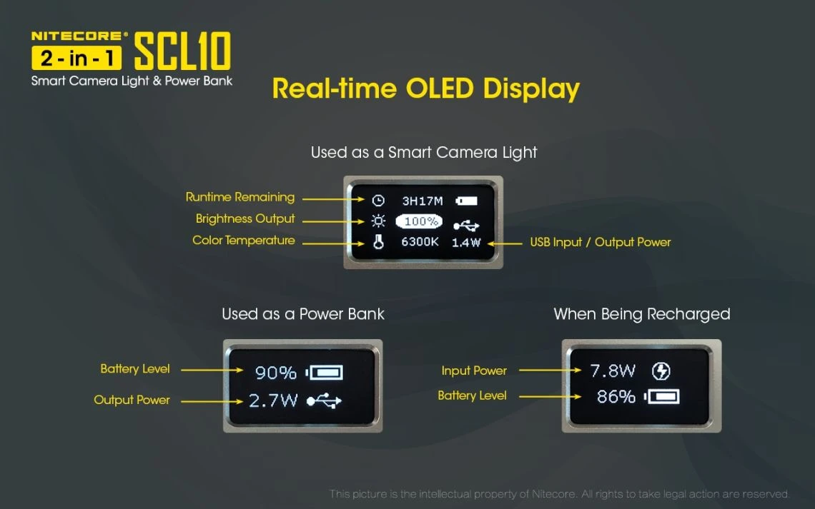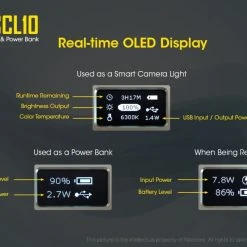 - OLED real-time display for runtime remaining, brightness output, colour temperature and more
