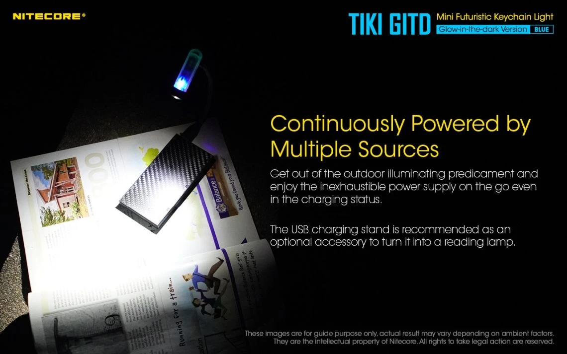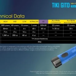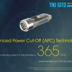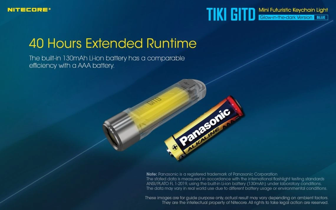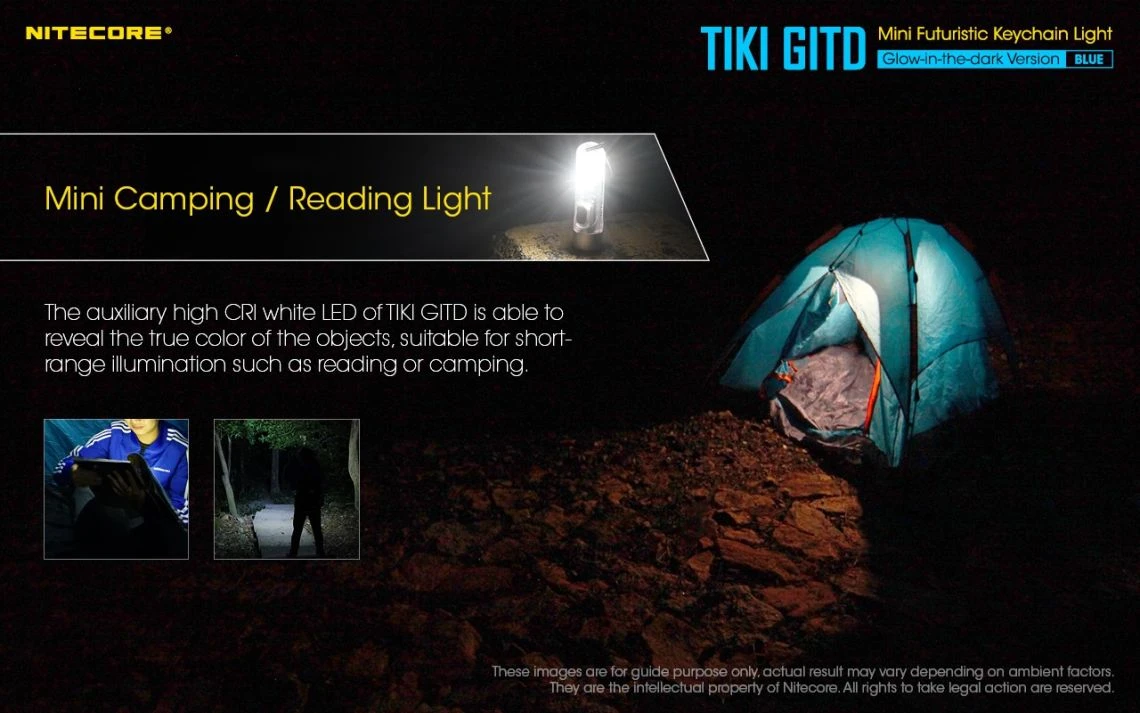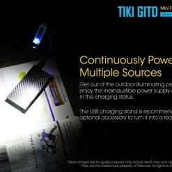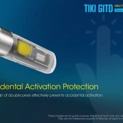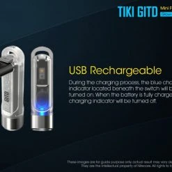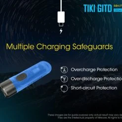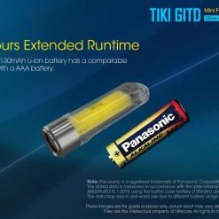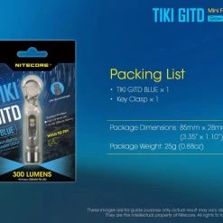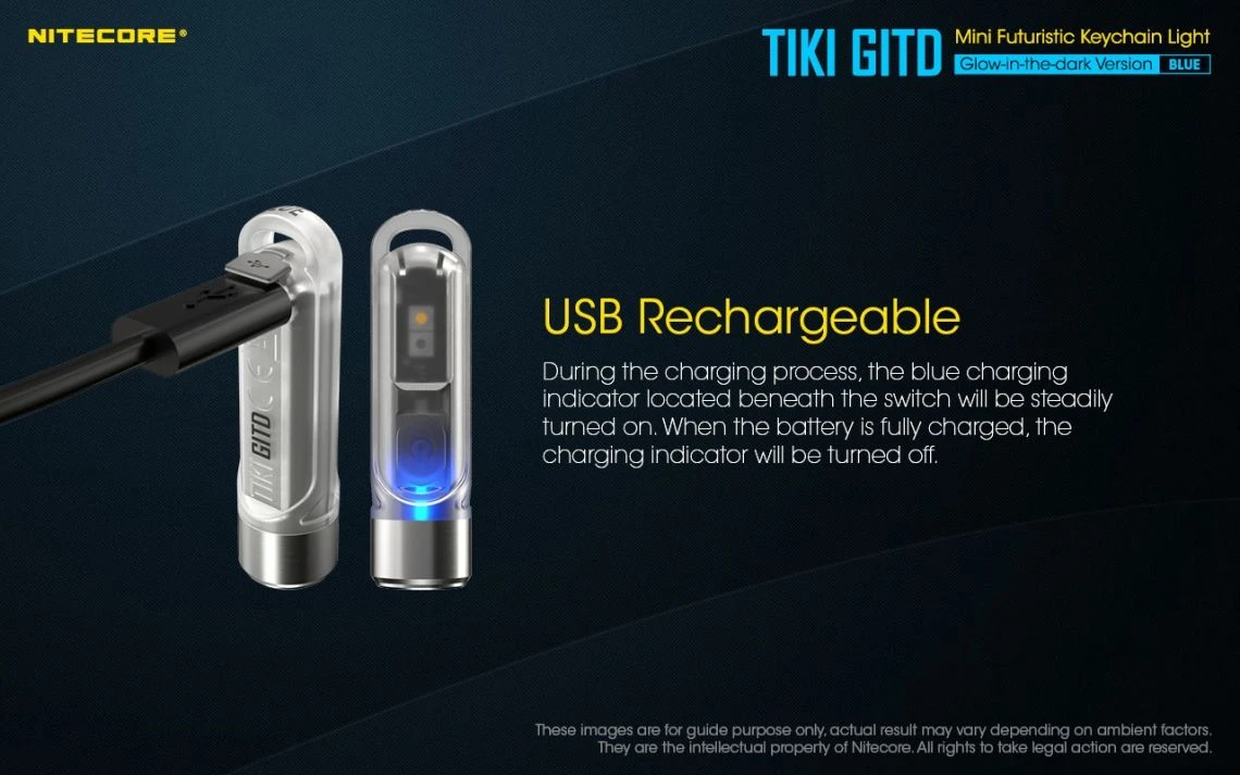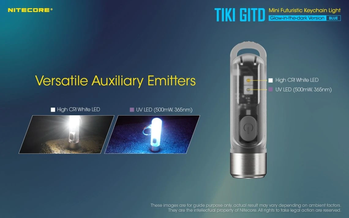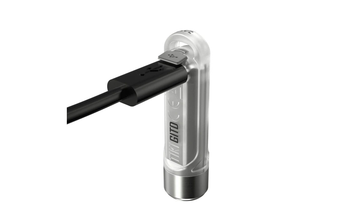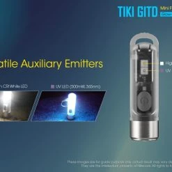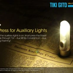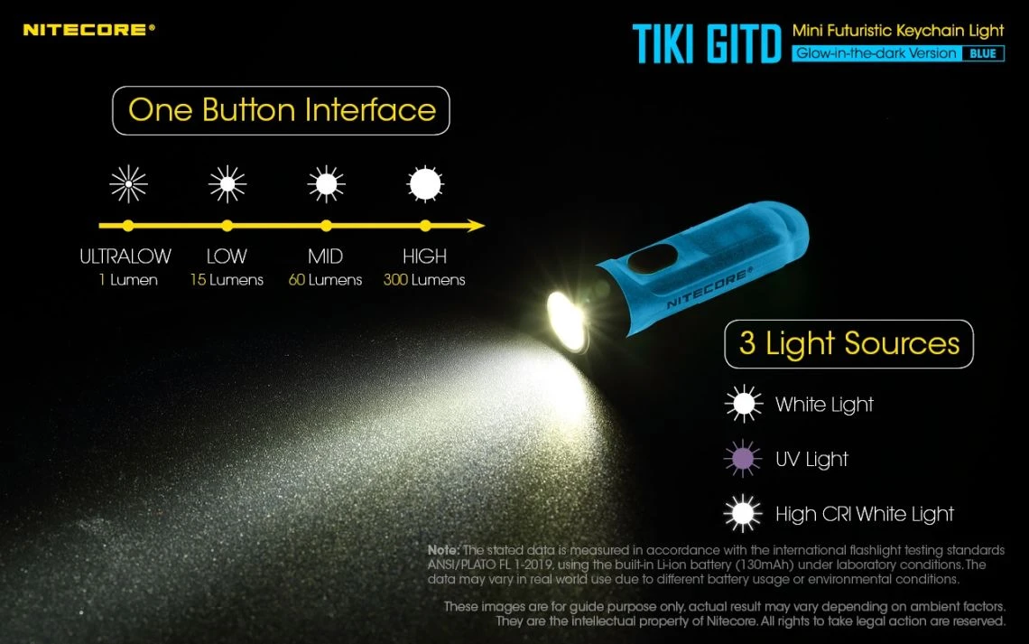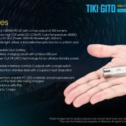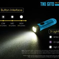 12g, 300 Lumens: The Nitecore TIKI GITD is a mini keychain light that emits a blue glow in the dark. The TIKI GITD will glow in the dark after being charged by its UV light for one second or the sunlight. This super compact light weighs only 12g but can produce up to 300 lumens of output. The TIKI GITD features 3 light sources (White light, UV light and high CRI white light) and can be easily controlled using the one button interface. The light has a built-in 130mAh Li-ion battery and is rechargeable via a Micro-USB cable.
