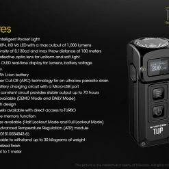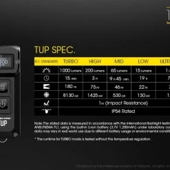 53.2g, 1000 Lumens: The Nitecore TUP is mini keychain LED torch. It can deliver 1000 lumen of output at 180 metres of beam distance. The built-in 1200mAh battery can be charged with micro USB. It is one of the powerful keychain light and available in two colours. USB rechargeable keychain light. Available in Black and Grey.