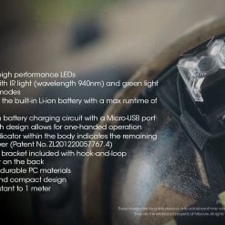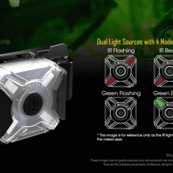 - Dual light sources with 4 modes available: IR Flashing, IR Beam, Green Flashing and Green Beam.