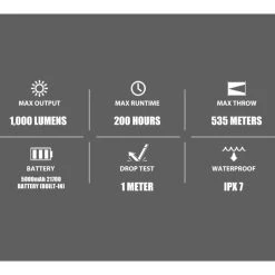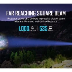- Delivers a maximum output of 1,000 lumens and a max beam distance of 535 metres