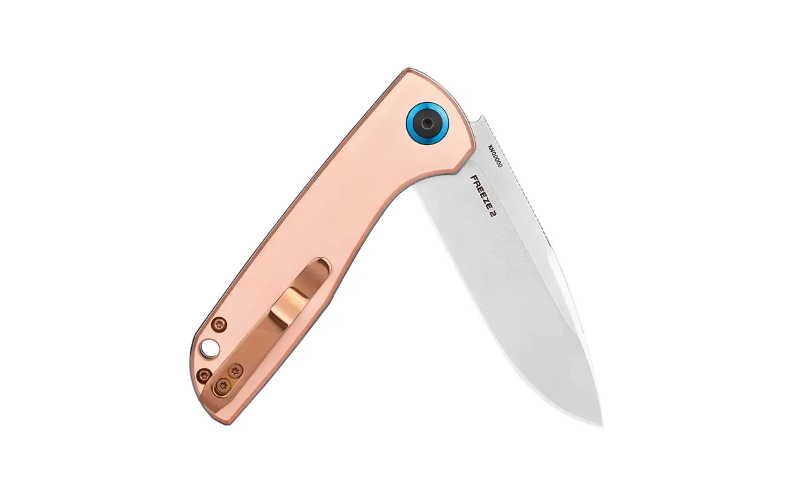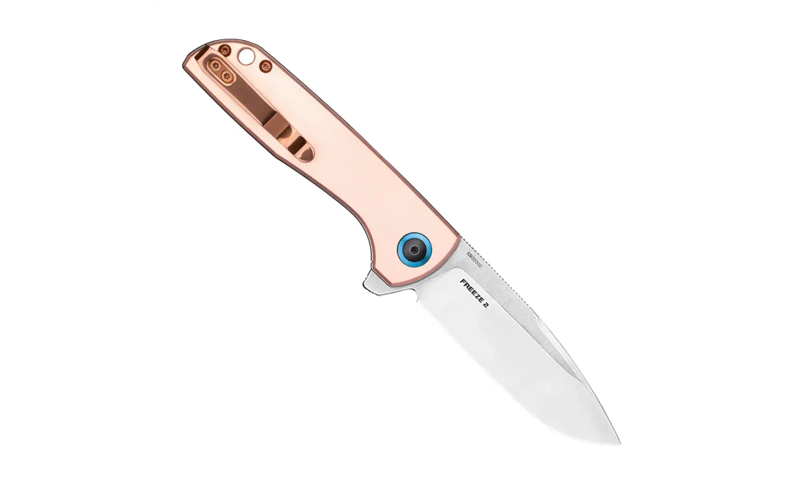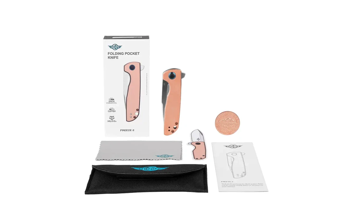 142g: The Olight Freeze 2 folding knife is designed for peak functionality in everyday use. It features a flipper tab for rapid deployment, so you can quickly get to work with no unnecessary hassle. Its 3.32in blade is made of 154CM stainless steel while boasting HRC60 hardness and excellent edge retention, ideal for cutting, chopping, peeling, piercing, and much more. Quick and easy access with the flipper tab while the robust stainless liner lock ensures an easy and safe lockup. The copper handle handle is exquisite and comfortable to touch.