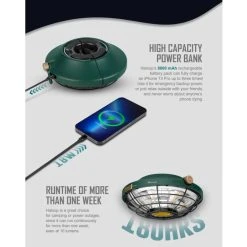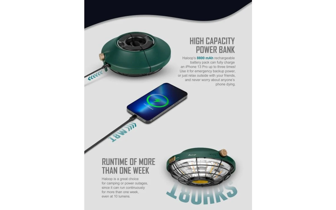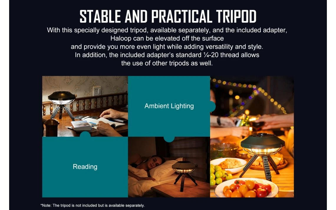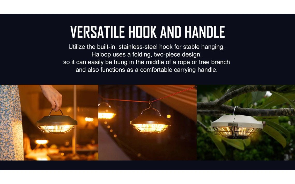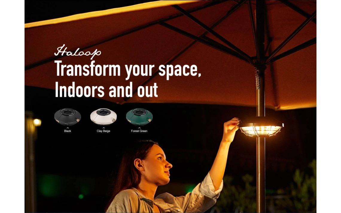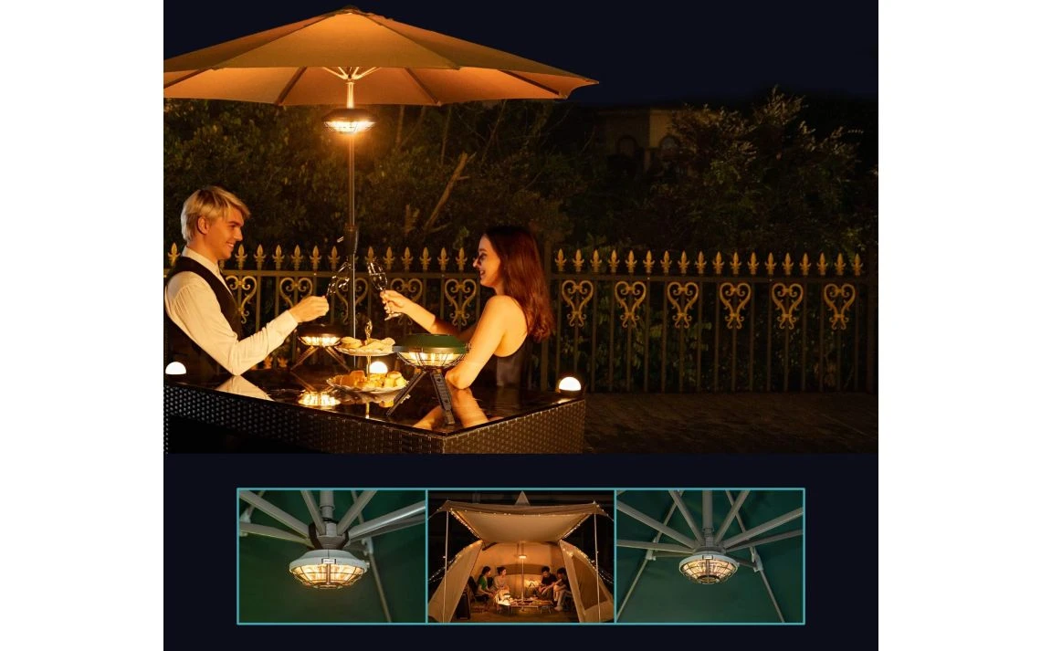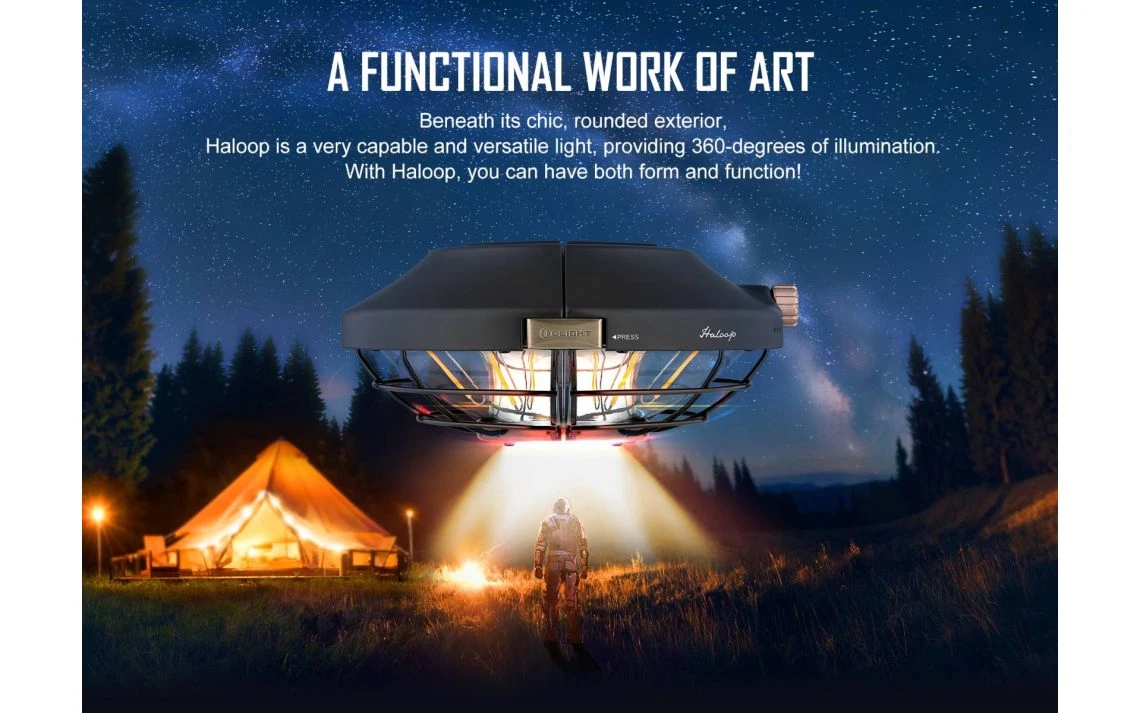 950g, 600 Lumens, 260 cd: The Olight Haloop is a rechargeable metal umbrella light shaped like a UFO, allowing users to fully enjoy the nightlife. It provides two light colors, orange and white. The 360-degree soft light beam creates a bright, cozy, and relaxing area in the darkness. With an 8800mAh rechargeable battery, it lasts all night long. The wide-range clamp fits almost all patio umbrella poles and the hooks and binding strap make it a versatile option for any patio or camping site. UFO-shaped rechargeable metal umbrella light!