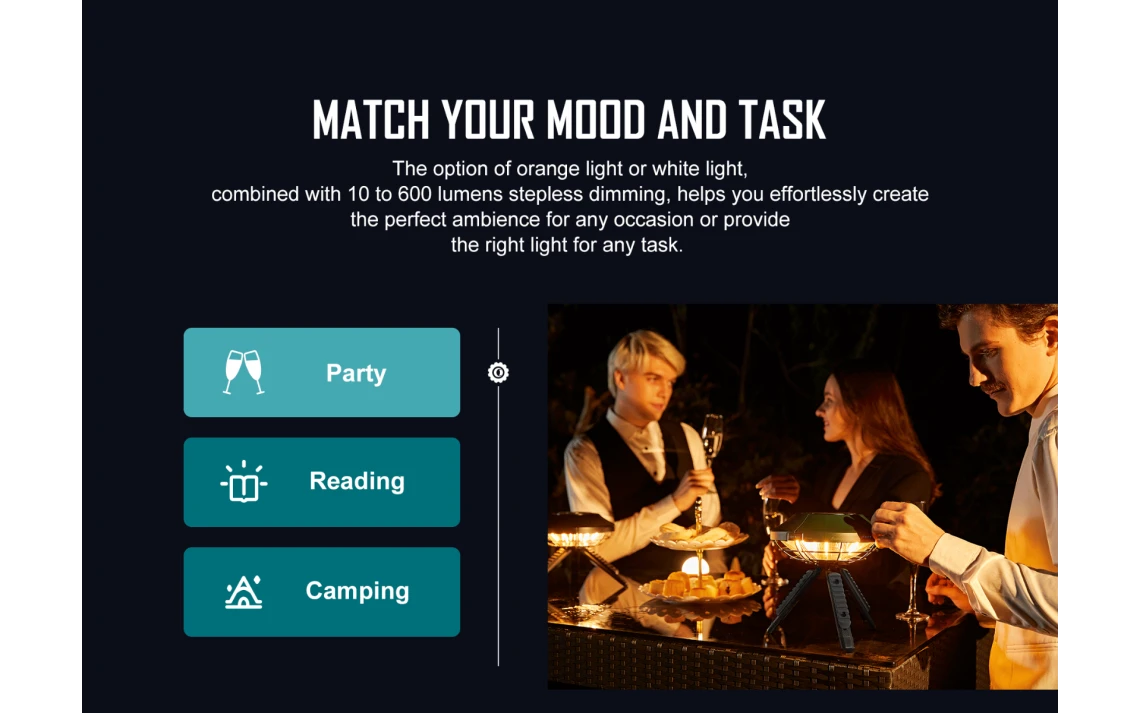 - Premium Light: Soft and wide 360-degree beam (10-600lm) that supports stepless dimming, dispels the darkness, and ushers in a relaxing nightlife on any patio or campsite.