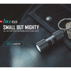 13g, 150 Lumens: The Olight i1R 2 EOS is rechargeable tiny keychain light. Powered by 70mAh built-in Li-ion battery and has a maximum output of 150 lumens. Lighweight design with compact size makes it perfect for keychain torch. Micro USB rechargeable keychain light!