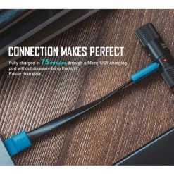 - Fast and convenient charging process. It can be fully charged in 75 minutes through a Micro-USB charging port without disassembling the light.