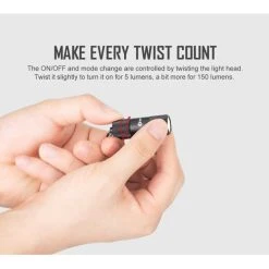 - ON/OFF and output changes are controlled through twisting the flashlight head. Twist it slightly to turn it on at 5 lumens and a bit further for 150 lumens.
