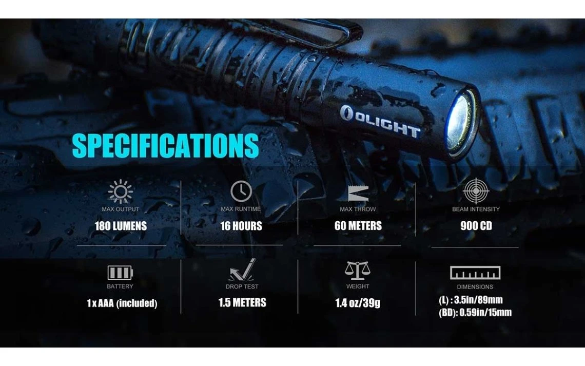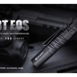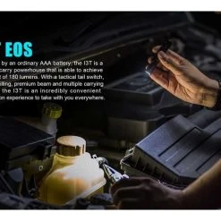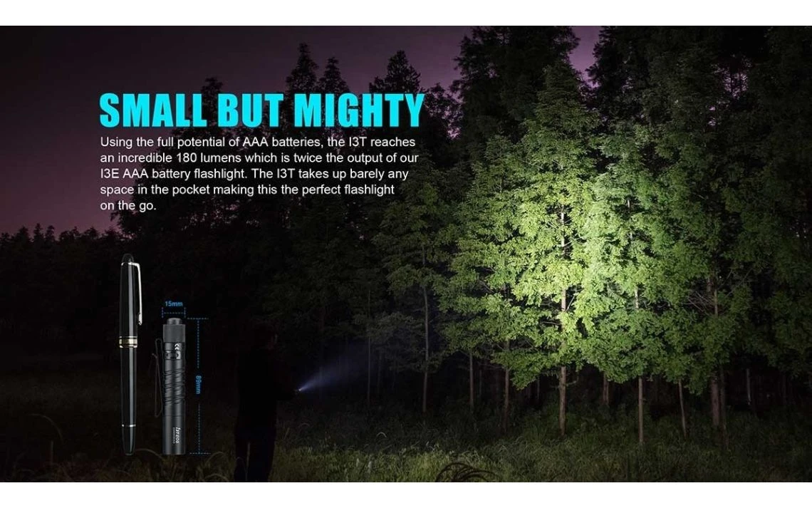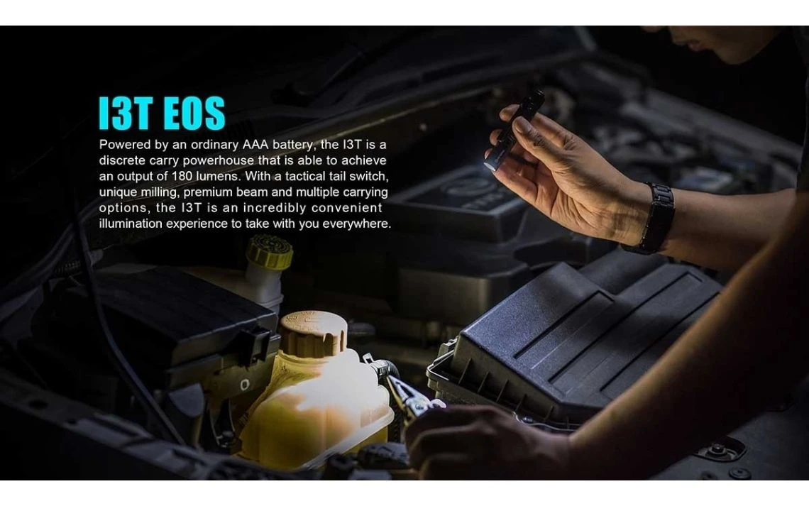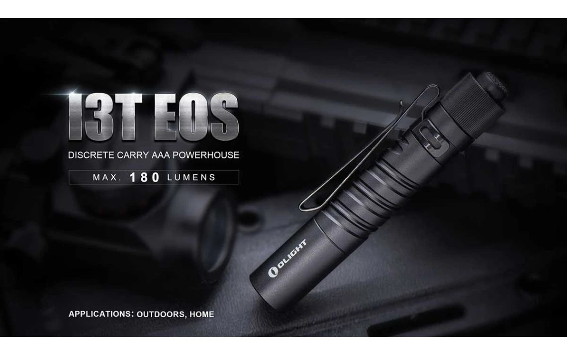 41g, 180 lumens: The Olight i3T EOS is a slim tail switch torch powered by a single AAA battery with a max output of 180 lumens. Equipped with Philips LUXEON TX and a TIR optic lens, the i3T gives a premium quality soft beam for reading at night along with a high mode for self-defence. Mini tail switch torch!