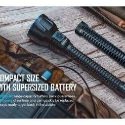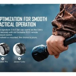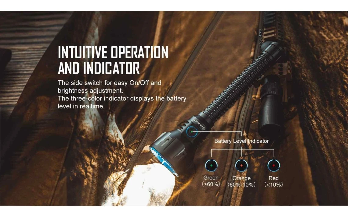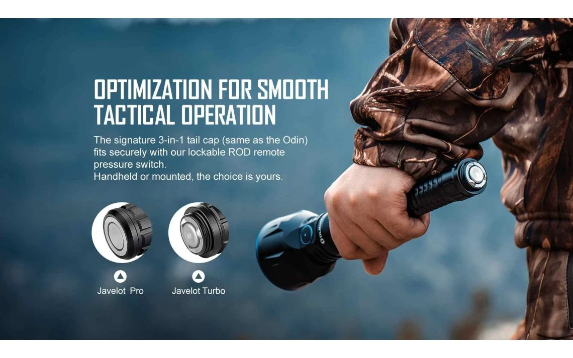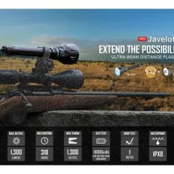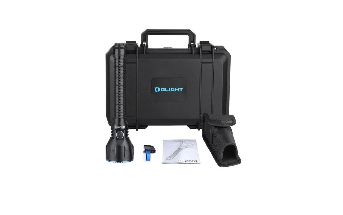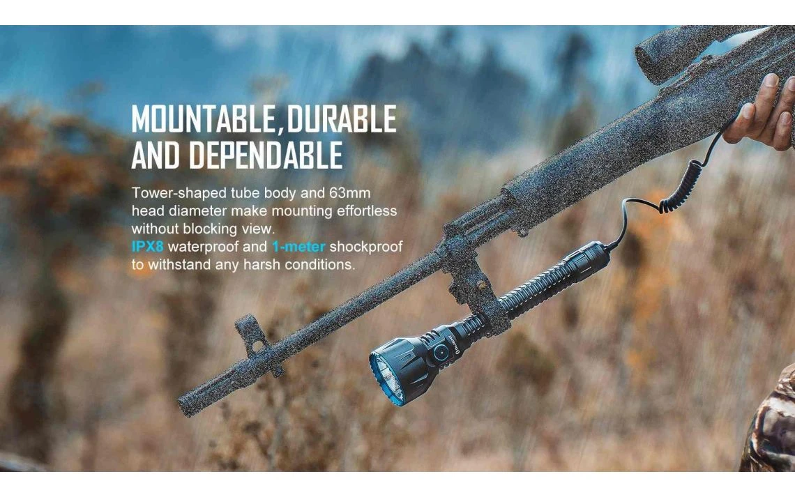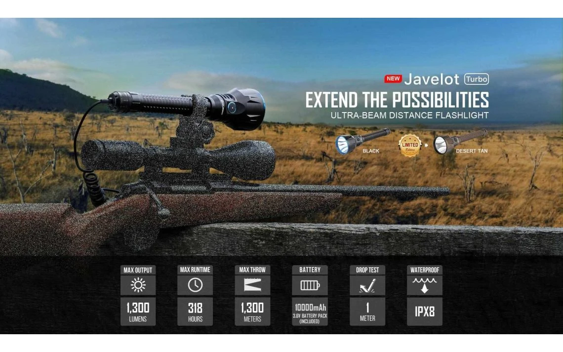 408g, 1,300 Lumens, 422,500cd: The Javelot Turbo is Olight’s longest distance hunting torch with a max beam distance of 1,300 metres and a max output of 1,300 lumens. The Javelot Turbo has an upgraded 10,000 mAh battery pack which is directly rechargeable via the convenient magnetic USB charging cable (included). The Javelot Turbo features a 3-in-1 tactical tail switch as well as a convenient side switch to cycle through 4 levels of output. This torch can easily be mounted to a rife (mounts not included) and is compatible with the ROD remote pressure switch for the perfect hunting setup. The Javelot Turbo comes in a durable carry case along with a holster. For more attachments see the Javelot Turbo Hunting Kit. 10,000mAh rechargeable battery pack included.