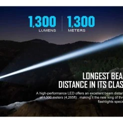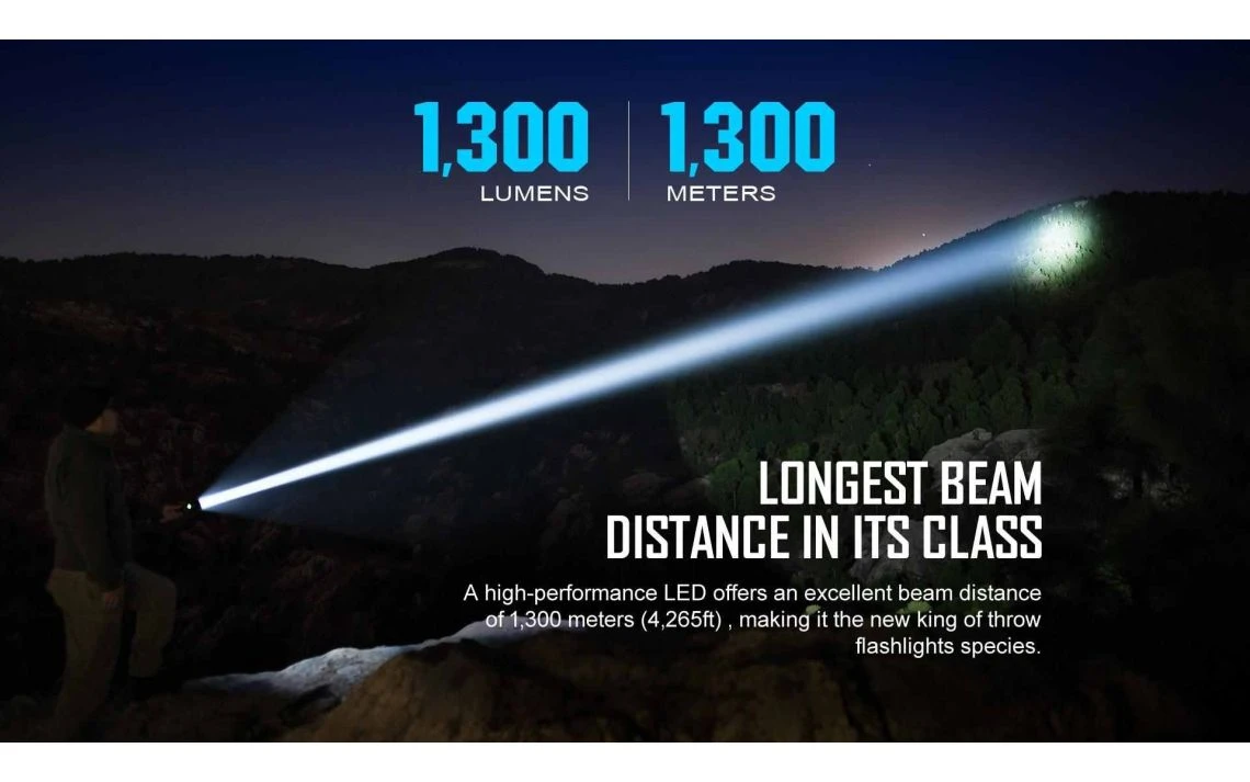 - Long beam distance up to 1,300 metres with a max output of 1,300 lumens