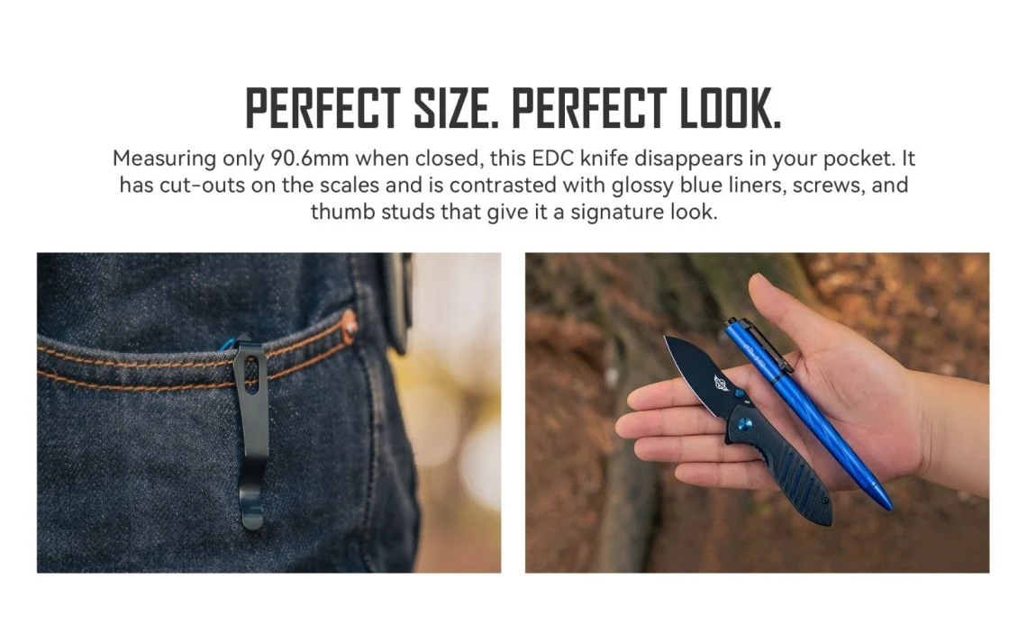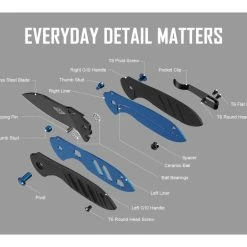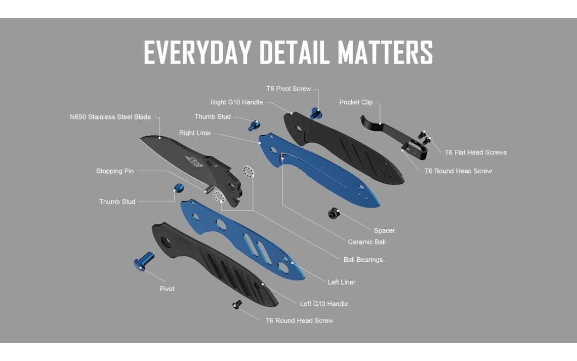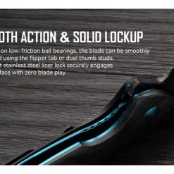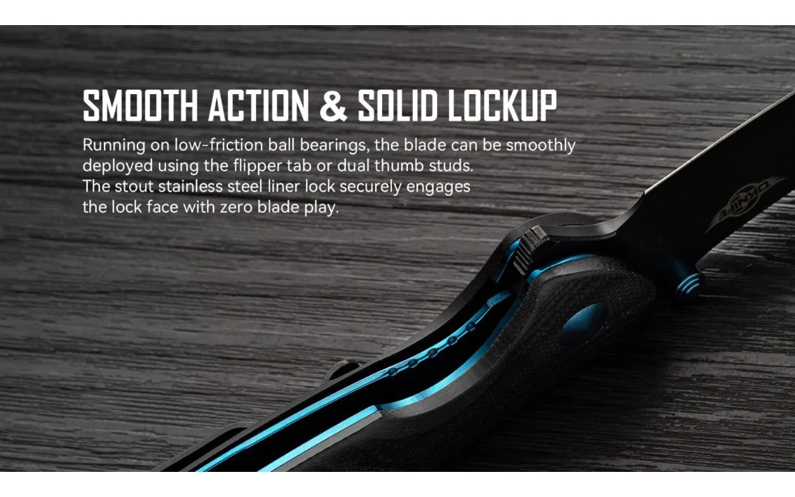 - The blade smoothly deploys with a flipper tab or dual thumb studs, thanks to its low-friction ball bearing pivot.