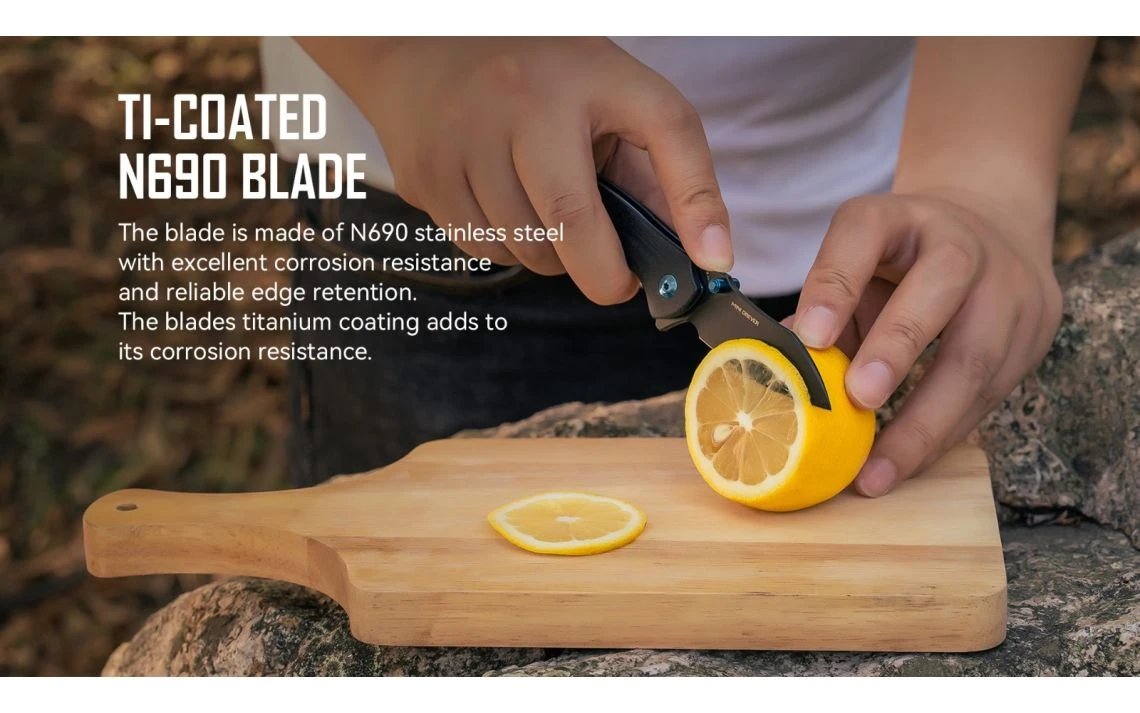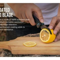 - Made of titanium-coated N690, its blade has exceptional corrosion resistance and reliable edge retention.